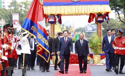 Đúng 9h ngày 19/11, tại trụ sở Quốc hội Campuchia ở thủ đô Phnom Penh, Chủ tịch Quốc hội Vương quốc Campuchia Samdech Heng Samrin đã chủ trì Lễ đón trọng thể Chủ tịch Quốc hội Vương Đình Huệ.