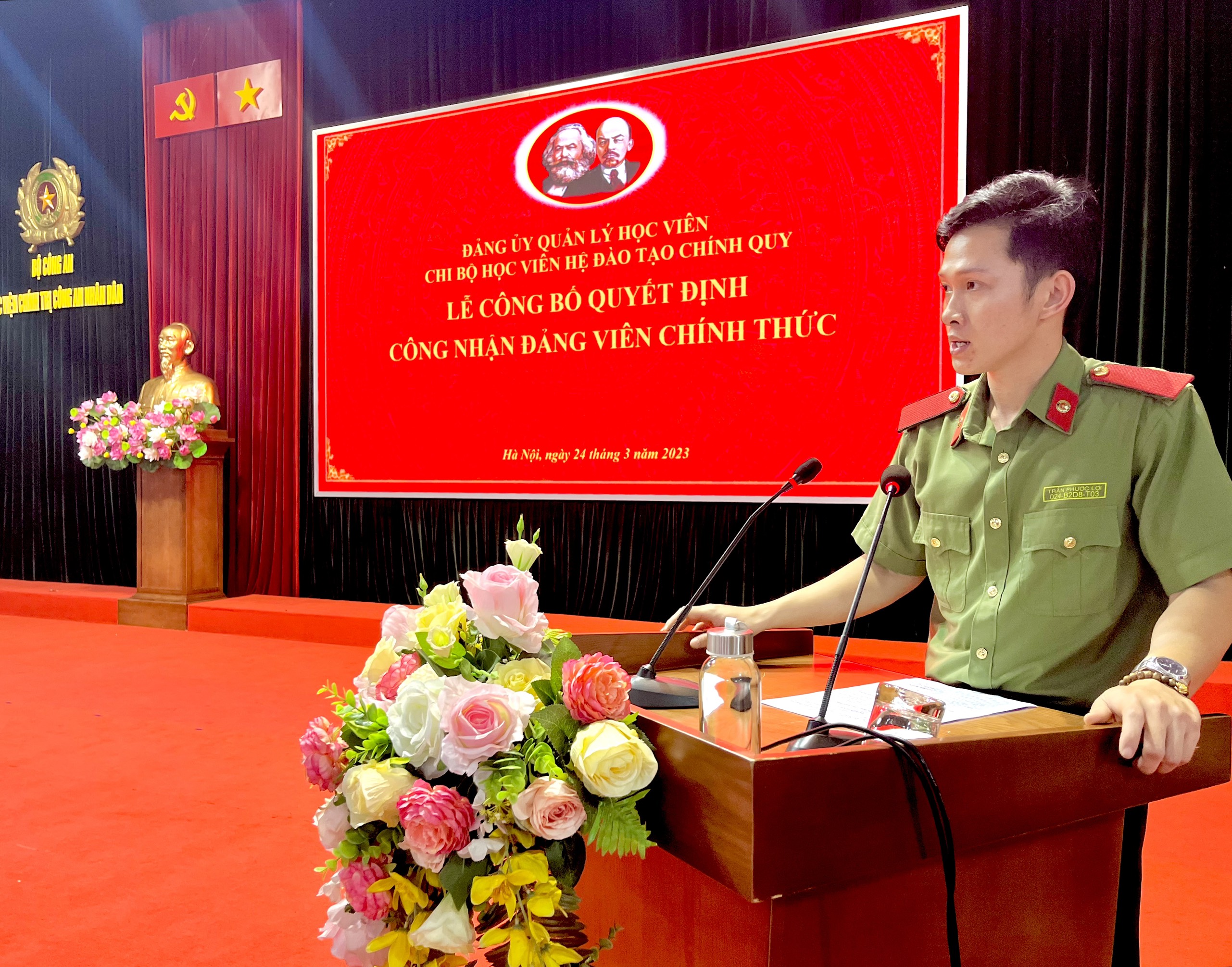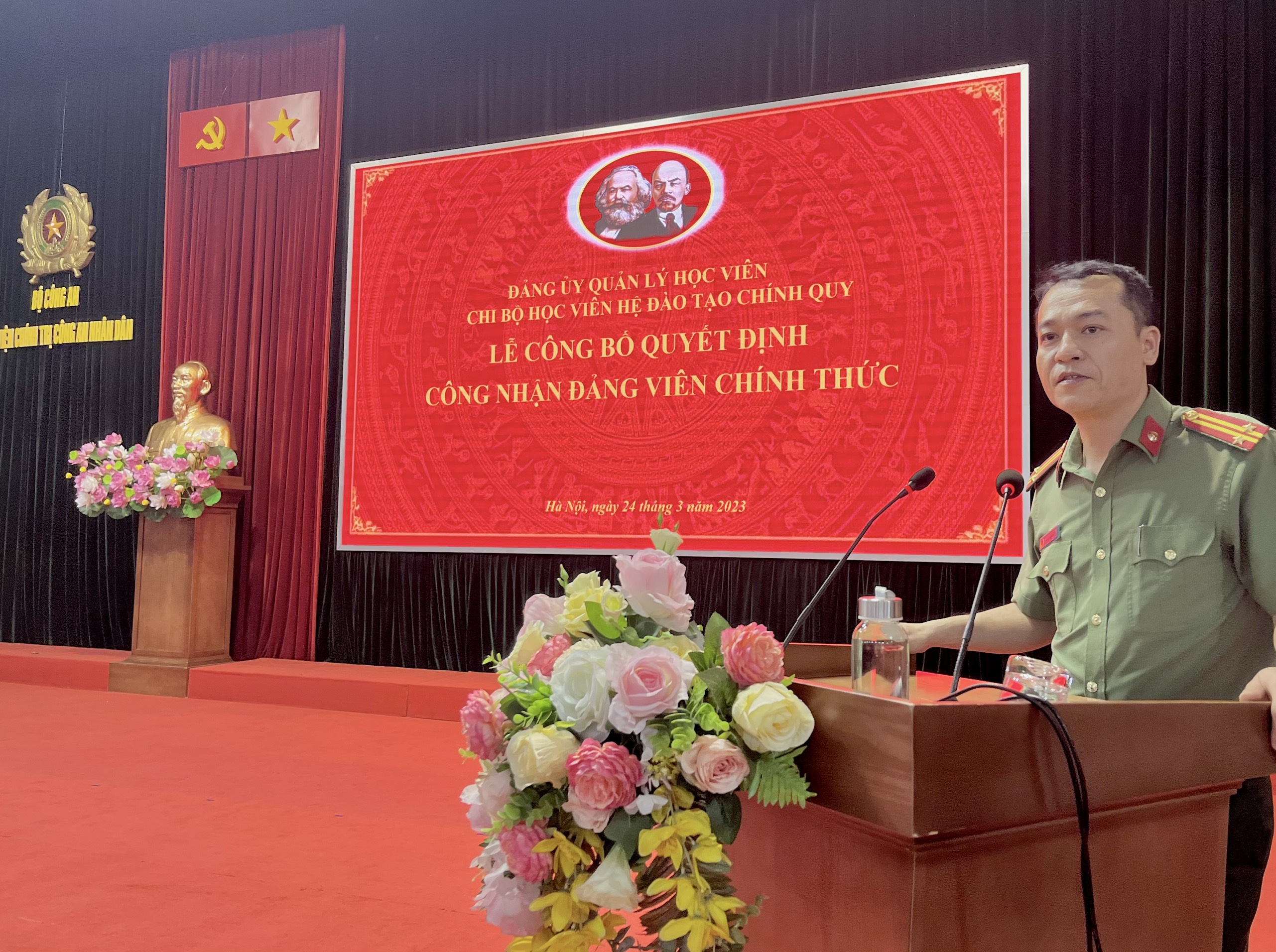 Phát biểu tại lễ công bố quyết định công nhận Đảng viên chính thức, đồng chí Trung tá Nguyễn Minh Hải đã chúc mừng 02 đồng chí Ma Văn Đạo và Nguyễn Lê Đạt đã trải qua 12 tháng thử thách, được công nhận đảng viên chính thức, đồng thời cũng động viên, khích lệ các học viên khác tiếp tục phấn đấu, tu dưỡng, rèn luyện, thường xuyên tự soi, tự sửa theo 6 điều Bác Hồ dạy CAND, chấp hành nghiêm kỷ luật và điều lệnh Công an nhân dân, thi đua đạt thành tích cao trong học tập, rèn luyện để sớm trở thành Đảng viên của lực lượng Công an nhân dân, góp phần thực hiện thắng lợi Nghị quyết số 12-NQ/TW, ngày 16/3/2022 của Bộ Chính trị về đẩy mạnh “xây dựng lực lượng công an thật sự trong sạch, vững mạnh, chính quy, tinh nhuệ, hiện đại”./.