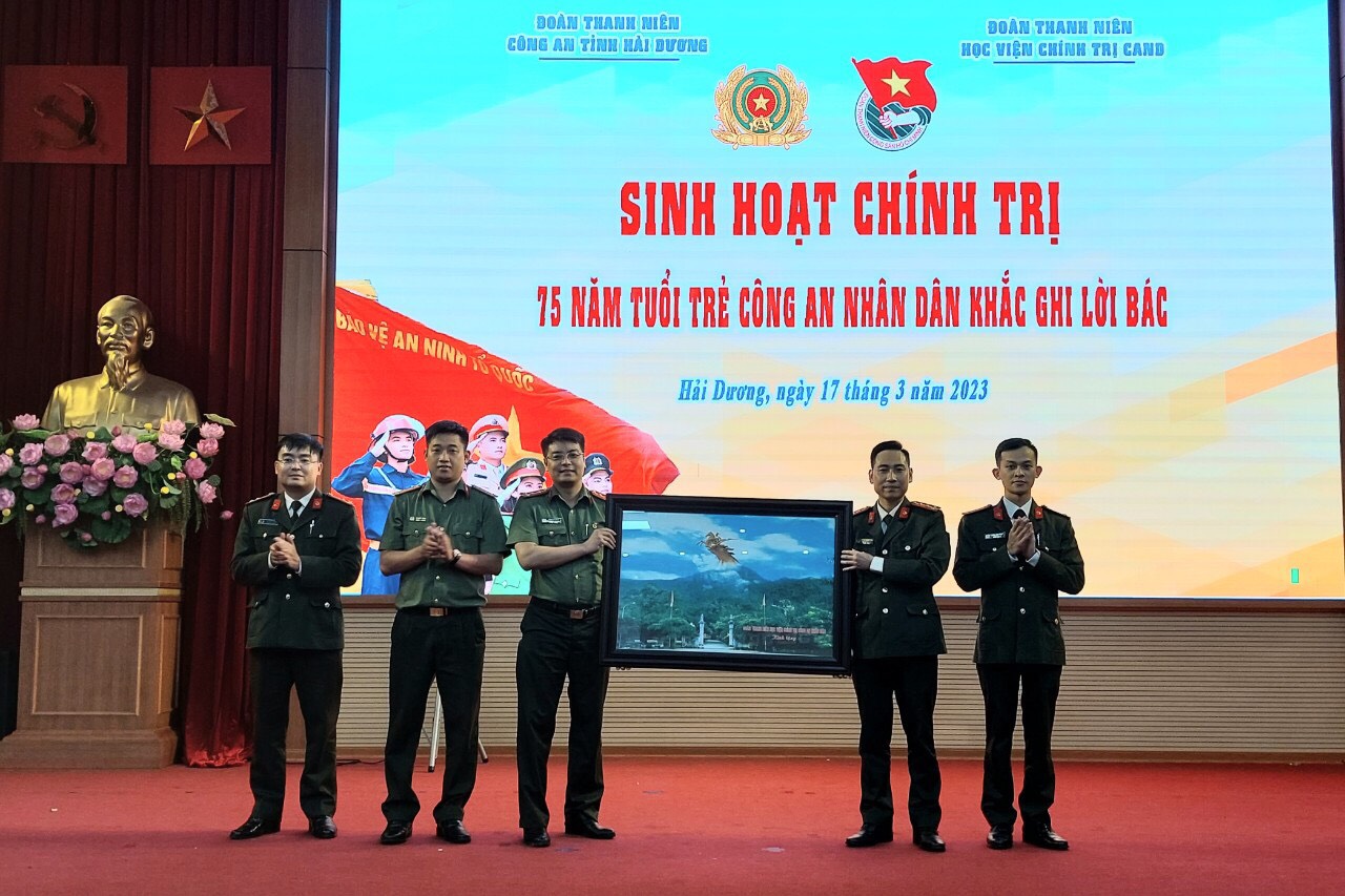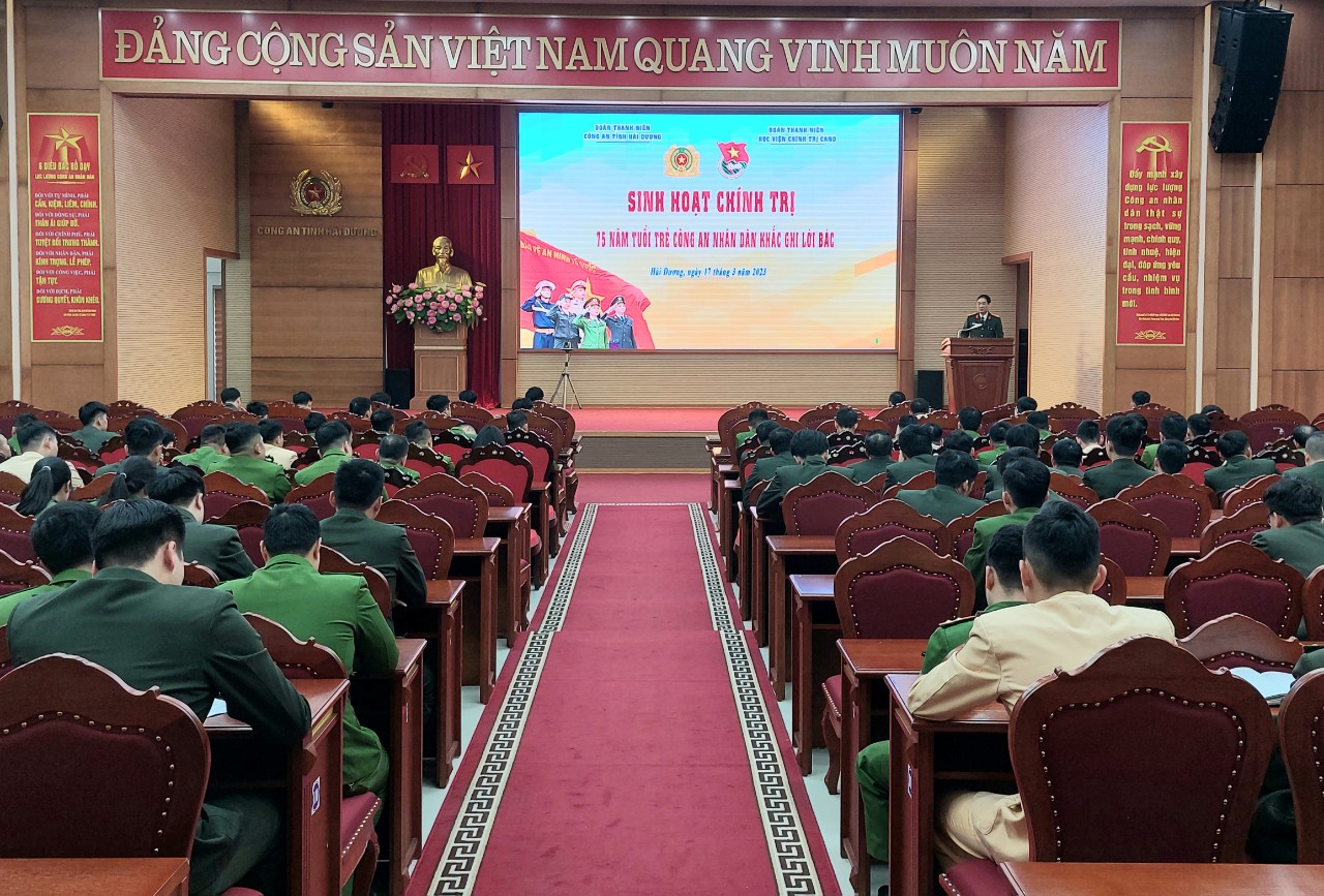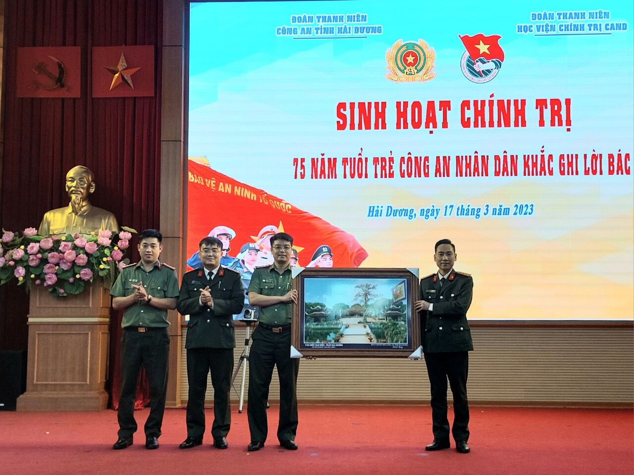Nhân kỷ niệm 75 năm Công an nhân dân học tập, thực hiện Sáu điều Bác Hồ dạy (11/3/1948 - 11/3/2023) và 75 năm Ngày Chủ tịch Hồ Chí Minh ra Lời kêu gọi thi đua ái quốc (11/6/1948 - 11/6/2023), chào mừng Tháng Thanh niên năm 2023; Được sự đồng ý của Đảng ủy, Ban Giám đốc Học viện Chính trị CAND và Đảng ủy, Ban Giám đốc Công an tỉnh Hải Dương; ngày 17/3/2023 tại trụ sở Công an tỉnh Hải Dương, Đoàn Thanh niên hai đơn vị đã phối hợp, tham mưu tổ chức chương trình sinh hoạt chính trị với chủ đề “75 năm tuổi trẻ Công an nhân dân khắc ghi lời Bác” và giao lưu thể thao bóng đá. Tham dự chỉ đạo, động viên tuổi trẻ hai đơn vị có các đồng chí lãnh đạo, đại biểu:
