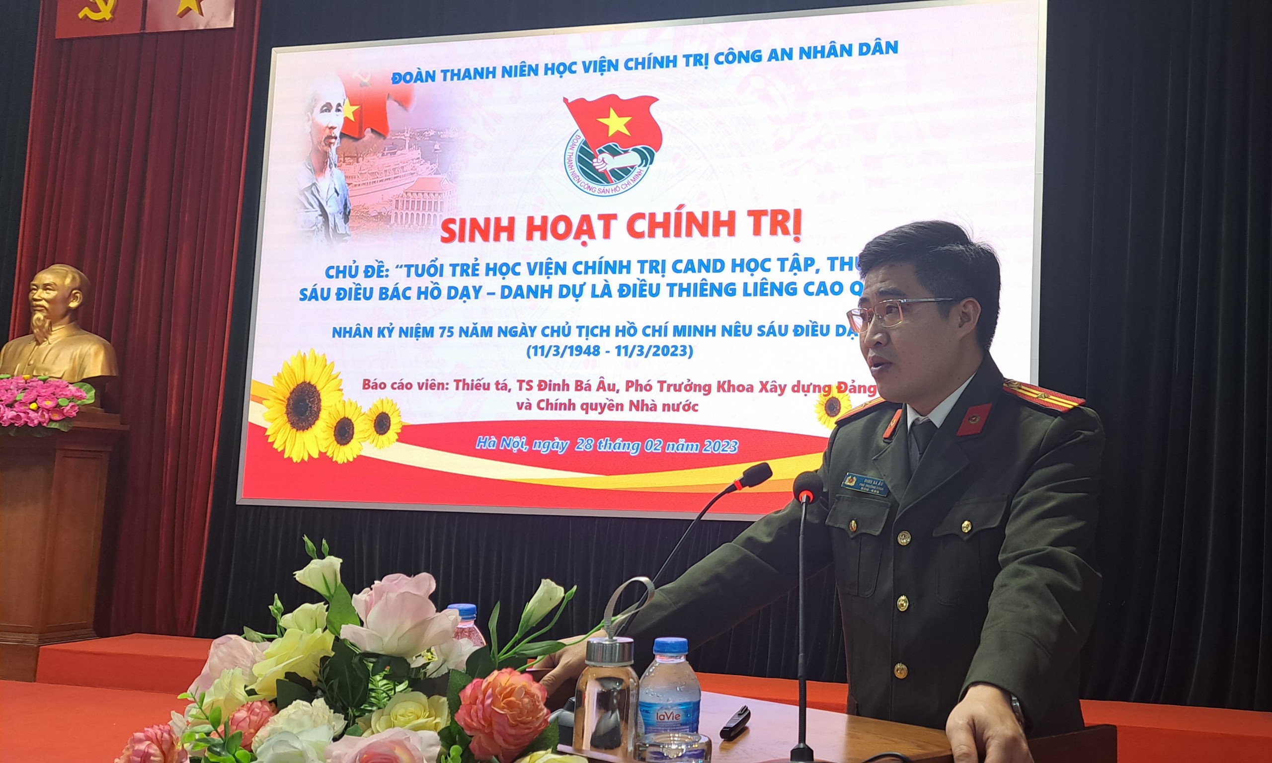 Kỷ niệm 75 năm Ngày Chủ tịch Hồ Chí Minh có Sáu điều dạy CAND (11/3/1948 - 11/3/2023), 09 năm Ngày công bố Quyết định thành lập Học viện Chính trị CAND (25/4/2014 - 25/4/2023), 92 năm Ngày thành lập Đoàn Thanh niên Cộng sản Hồ Chí Minh, 67 năm Ngày Truyền thống Đoàn Thanh niên Bộ Công an, được sự đồng ý của Ban Thường vụ Đảng ủy, Ban Giám đốc Học viện, tối ngày 28/2/2023, Đoàn Thanh niên Học viện Chính trị CAND đã tổ chức Lễ Phát động Tháng Thanh niên, năm 2023 và sinh hoạt chính trị với chủ đề “Tuổi trẻ Học viện Chính trị Công an nhân dân học tập, thực hiện 6 điều Bác Hồ dạy” - “Danh dự là điều thiêng liêng, cao quý nhất”.