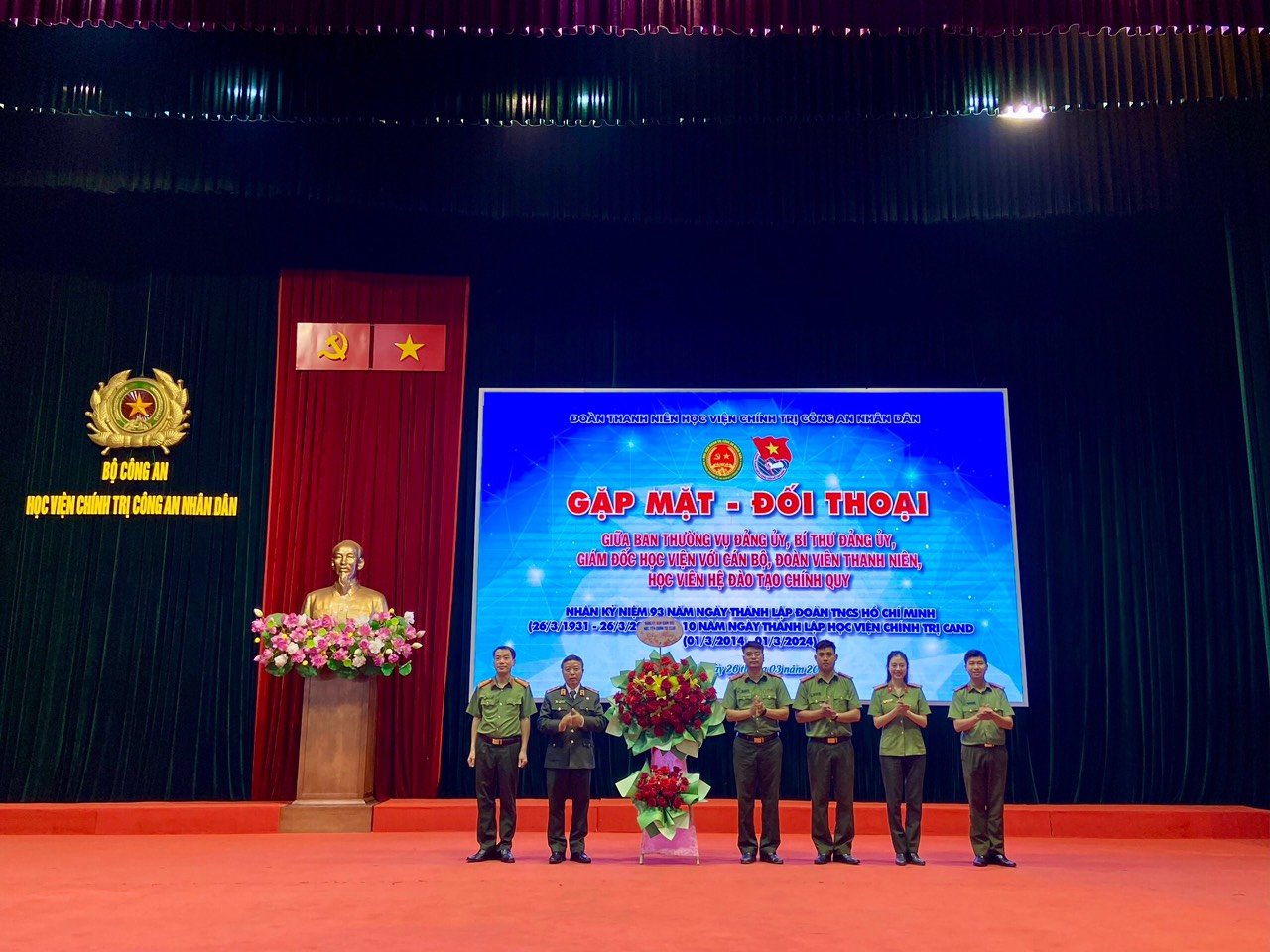 Nhân dịp kỷ niệm 93 năm Ngày thành lập Đoàn TNCS Hồ Chí Minh (26/3/1931 - 26/3/2024), 10 năm Ngày thành lập Học viện Chính trị CAND. Được sự đồng ý của Ban Thường vụ Đảng ủy, Ban Giám đốc Học viện; sáng ngày 26/3/2024, Đoàn Thanh niên Học viện chủ trì, phối hợp với Phòng Quản lý học viên, các đơn vị chức năng tham mưu tổ chức chương trình Gặp mặt - Đối thoại giữa Ban Thường vụ Đảng ủy, Bí thư Đảng ủy, Giám đốc Học viện với cán bộ, đoàn viên thanh niên, học viên Học viện. Trung tướng, PGS.TS Phan Xuân Tuy, Bí thư Đảng ủy, Giám đốc Học viện, chủ trì buổi gặp mặt. Tham dự chương trình có Thượng tá, TS Nguyễn Văn Tuấn, Ủy viên Ban Thường vụ, Phó Giám đốc Học viện, cùng đại diện cấp ủy, lãnh đạo các đơn vị chức năng liên quan, cùng toàn thể các đồng chí cán bộ, đoàn viên thanh niên, học viên Học viện.