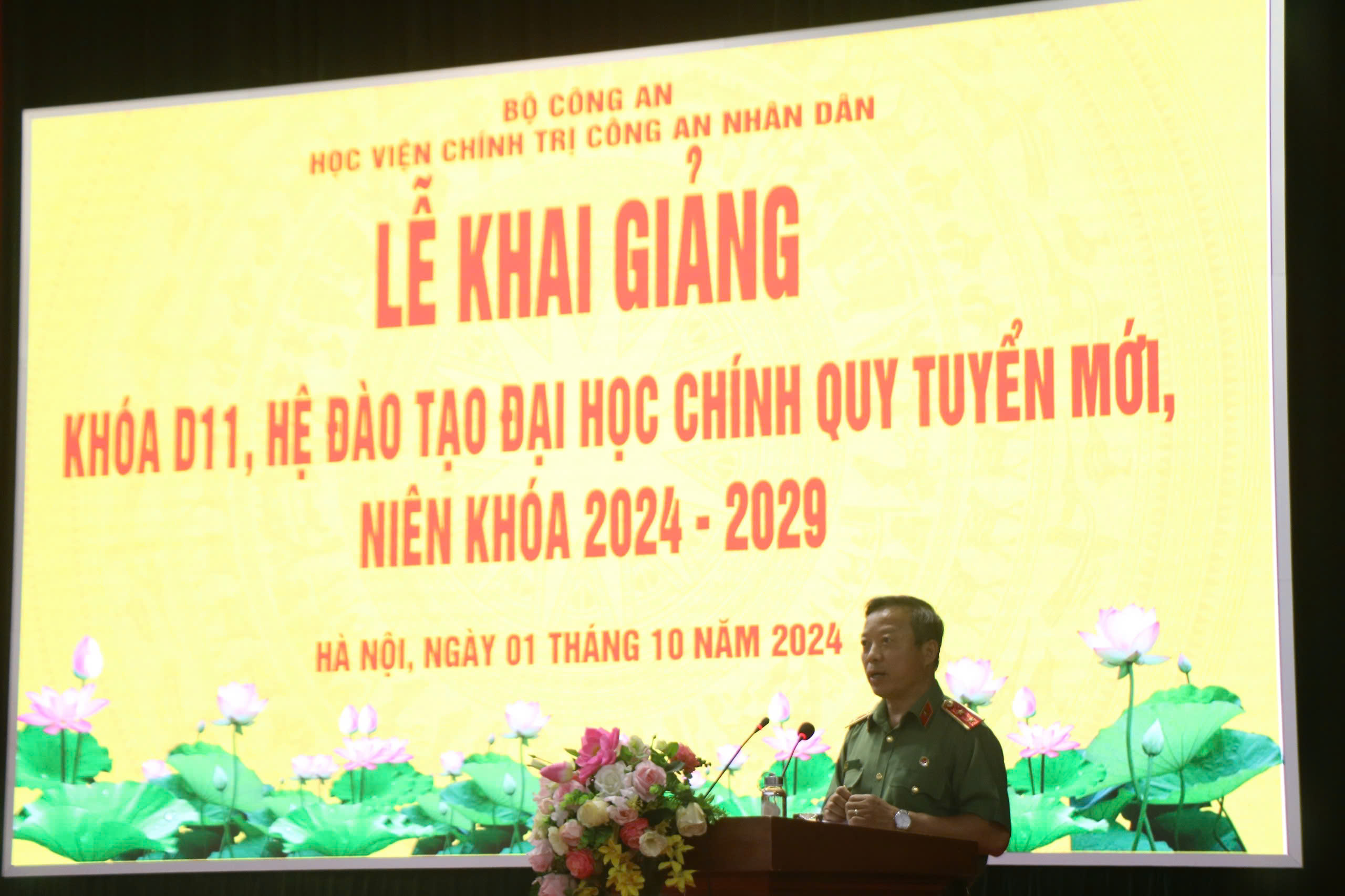 Phát biểu chỉ đạo trong buổi Lễ Khai giảng, đồng chí Trung tướng, PGS. TS, NGƯT Phan Xuân Tuy, Bí thư Đảng ủy, Giám đốc Học viện dự thân ái gửi lời chúc mừng tới các tân học viên Khóa D11 đã xuất sắc vượt qua kỳ thi Tốt nghiệp Trung học phổ thông Quốc gia và kỳ thi đánh giá năng lực của Bộ Công an năm 2024 với tỷ lệ “chọi” rất cao, được tổ chức nghiêm túc, khoa học, chặt chẽ, công khai, minh bạch để trúng tuyển và trở thành tân học viên Học viện Chính trị CAND. Qua báo cáo nhanh của của Phòng Quản lý đào tạo và bồi dưỡng nâng cao, Phòng Quản lý học viên về kết quả kiểm tra hồ sơ tuyển sinh, học bạ Trung học phổ thông và kết quả kỳ thi đánh giá năng lực của Bộ Công an năm 2024, đồng chí Bí thư, Đảng ủy, Giám đốc Học viện đánh giá cao chất lượng đầu vào của học viên Khóa D11; đồng thời, tự hào, tin tưởng học viên Khóa D11 đã, đang và sẽ luôn hoàn thành xuất sắc nhiệm vụ khóa học đề ra. Theo đó, đồng chí Bí thư Đảng ủy, Giám đốc Học viện yêu cầu học viên Khóa D11 thực hiện tốt một số nội dung sau: (1) Phải nhận thức đúng đắn, tự giác cao nhất với tâm thế là chiến sĩ CAND Việt Nam anh hùng; luôn chấp hành nghiêm Điều lệnh CAND, 6 điều Bác Hồ dạy CAND, duy trì kỷ luật, kỷ cương, giải quyết toàn diện các mối quan hệ của người chiến sĩ CAND nhất là đối với công việc, đối với tự mình, đối với đồng chí, đồng đội và đối với Nhân dân. (2) Ngay từ những ngày đầu tiên, từng học viên luôn xác định phải “tự lực, tự cường”, tự giác trong học tập, rèn luyện, kết hợp giữa học tập lý thuyết, nghiên cứu tài liệu với sự hướng dẫn của thầy, cô giáo; phải xác định cho bản thân động cơ, mục đích học tập, rèn luyện đúng đắn; từ đó xác định và xây dựng cho bản thân phương pháp học tập khoa học, phù hợp với bản thân; đồng thời, phải luôn đặt ra cho mình mục tiêu và thời gian cụ thể để đạt được mục tiêu đó như: kết thúc khóa học được cấp Bằng Tốt nghiệp loại Giỏi; được kết nạp vào Đảng Cộng sản Việt Nam năm học thứ ba,... phấn đấu để khi kết thúc khóa học trở thành sĩ quan chính trị của lực lượng CAND, có bản lĩnh chính trị vững vàng, phẩm chất đạo đức cách mạng trong sáng, nghiệp vụ pháp luật tinh thông, có khả năng hòa nhập, làm việc trong môi trường quốc tế, xứng đáng là lứa học viên của lực lượng CAND đào tạo hàng năm đầu tiên trong lực lượng CAND thực hiện nghiêm túc Nghị quyết 12 của Bộ Chính trị ngày 16/3/2022. (3) Phải xác định và luôn coi Học viện là ngôi nhà thứ hai của mình; thầy, cô, học viên các khóa là gia đình của các mình; từ đó, để thể hiện tinh thần, thái độ, hành động góp phần xây dựng văn hóa học viên của trường Đảng trong CAND.