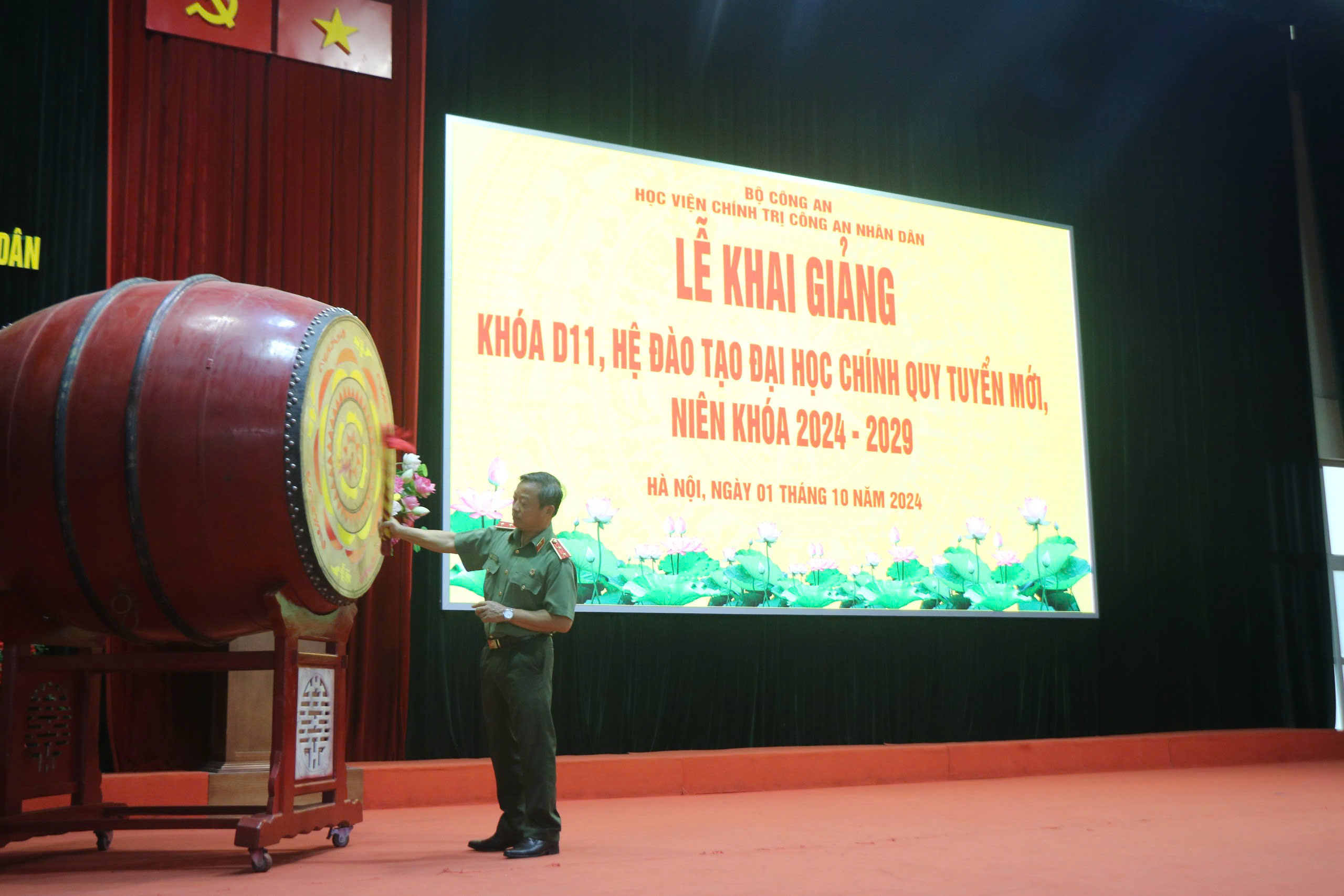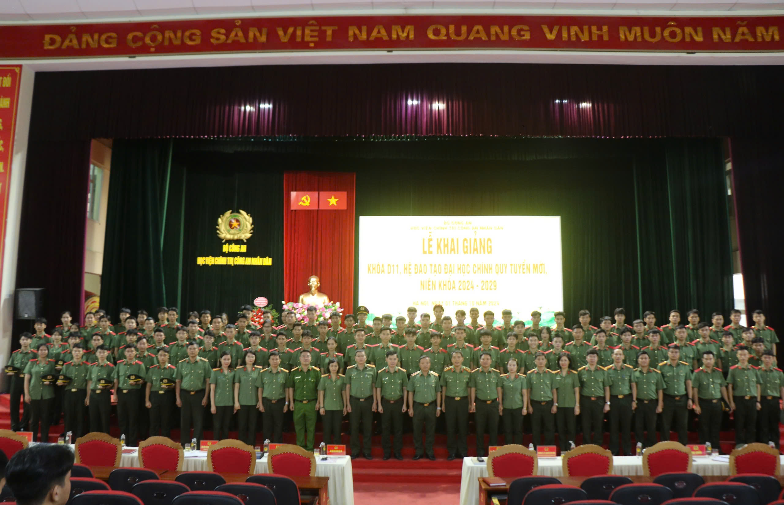 Hôm nay, ngày 01/10/2024, hòa chung không khí mùa thu lịch sử, với những ngày lễ lớn của Đảng, Nhà nước và kỷ niệm 70 năm ngày giải phòng Thủ đô Hà Nội, Học viện Chính trị Công an nhân dân (CAND) long trọng tổ chức Lễ Khai giảng cho học viên đào tạo đại học chính quy tuyển mới, Khóa D11, niên khóa 2024 - 2029. Đồng chí Trung tướng, PGS. TS, NGƯT Phan Xuân Tuy, Bí thư Đảng ủy, Giám đốc Học viện dự và chủ trì buổi Lễ. Tham dự buổi Lễ, về phía đại biểu khách mời có đồng chí Đại tá Trần Nam Thắng, Phó Hiệu trưởng Trường Cao đẳng An ninh nhân dân 1; đồng chí Trung tá An Thanh Tùng, Phó Trưởng phòng, Cục Đào tạo; đồng chí Trung tá Nguyễn Tuấn Anh, Phó Giám đốc Trung tâm Huấn luyện, bồi dưỡng nghiệp vụ và giáo dục nghề nghiệp số 1, Bộ Tư lệnh Cảnh sát cơ động. Về phía Học viện Chính trị CAND có các đồng chí Thượng tá, TS Nguyễn Văn Tuấn, Ủy viên Ban Thường vụ Đảng ủy, Phó Giám đốc Học viện, đại diện lãnh đạo các đơn vị, giảng viên và toàn thể học viên Khóa D11 và các đơn vị học viên trong toàn Học viện.