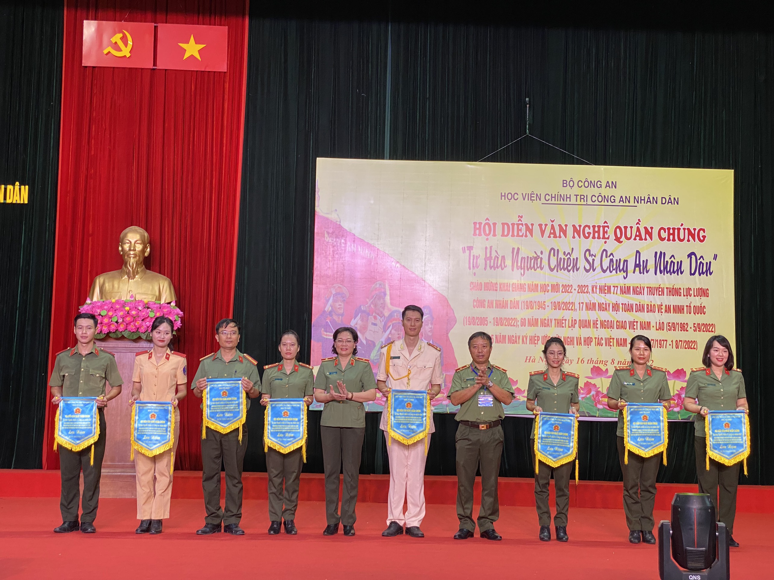 Đồng chí Thiếu tướng, PGS.TS Phan Xuân Tuy, Bí thư Đảng ủy, Giám đốc Học viện, Trưởng Ban chỉ đạo Hội diễn và đồng chí Thiếu tướng, PGS.TS Đinh Ngọc Hoa, Phó Bí thư Đảng ủy, Phó Giám đốc Học viện tặng cờ lưu niệm cho các đội diễn.