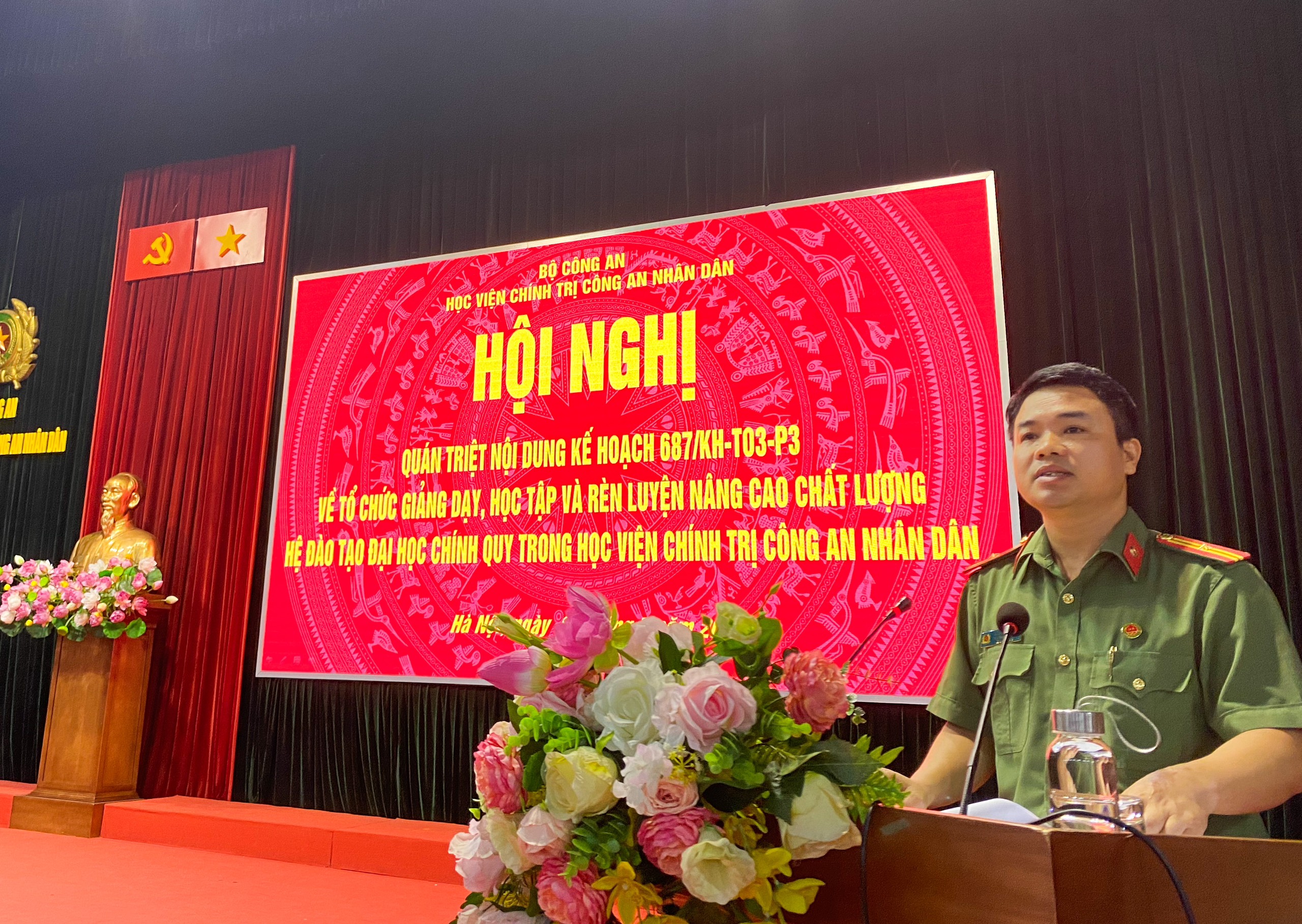 Quán triệt, triển khai thực hiện Chỉ thị số 03/CT-BCA ngày 02/6/2023 của Bộ trưởng Bộ Công an về nâng cao chất lượng công tác quản lý, giáo dục học viên của các cơ sở đào tạo, bồi dưỡng trong Công an nhân dân; thực hiện Kế hoạch số 687/KH-T03-P3, ngày 15/4/2024 của Học viện Chính trị CAND về tổ chức giảng dạy, học tập và rèn luyện nâng cao chất lượng đào tạo hệ đại học chính quy (gọi tắt là Kế hoạch 687); chiều ngày 22/4/2024, Học viện tổ chức Hội nghị quán triệt thực hiện kế hoạch trên.