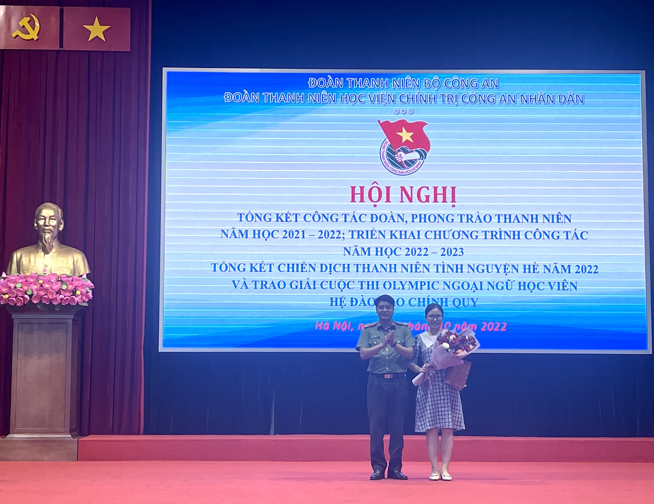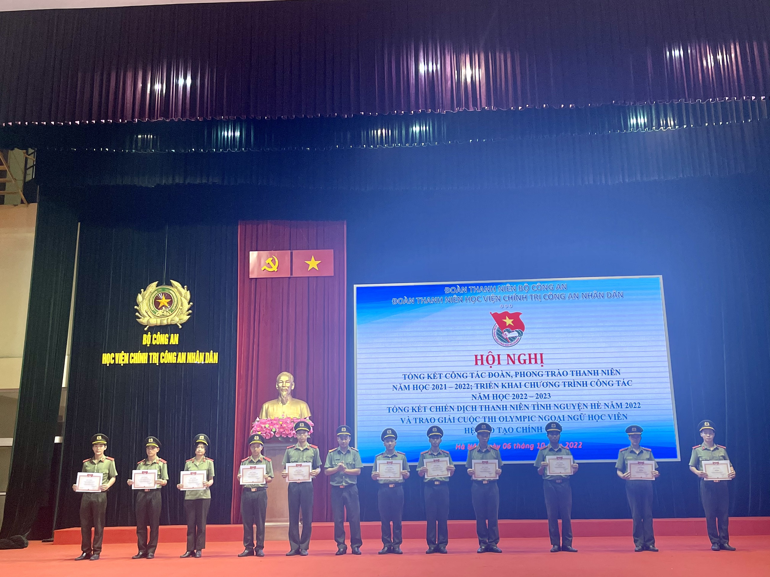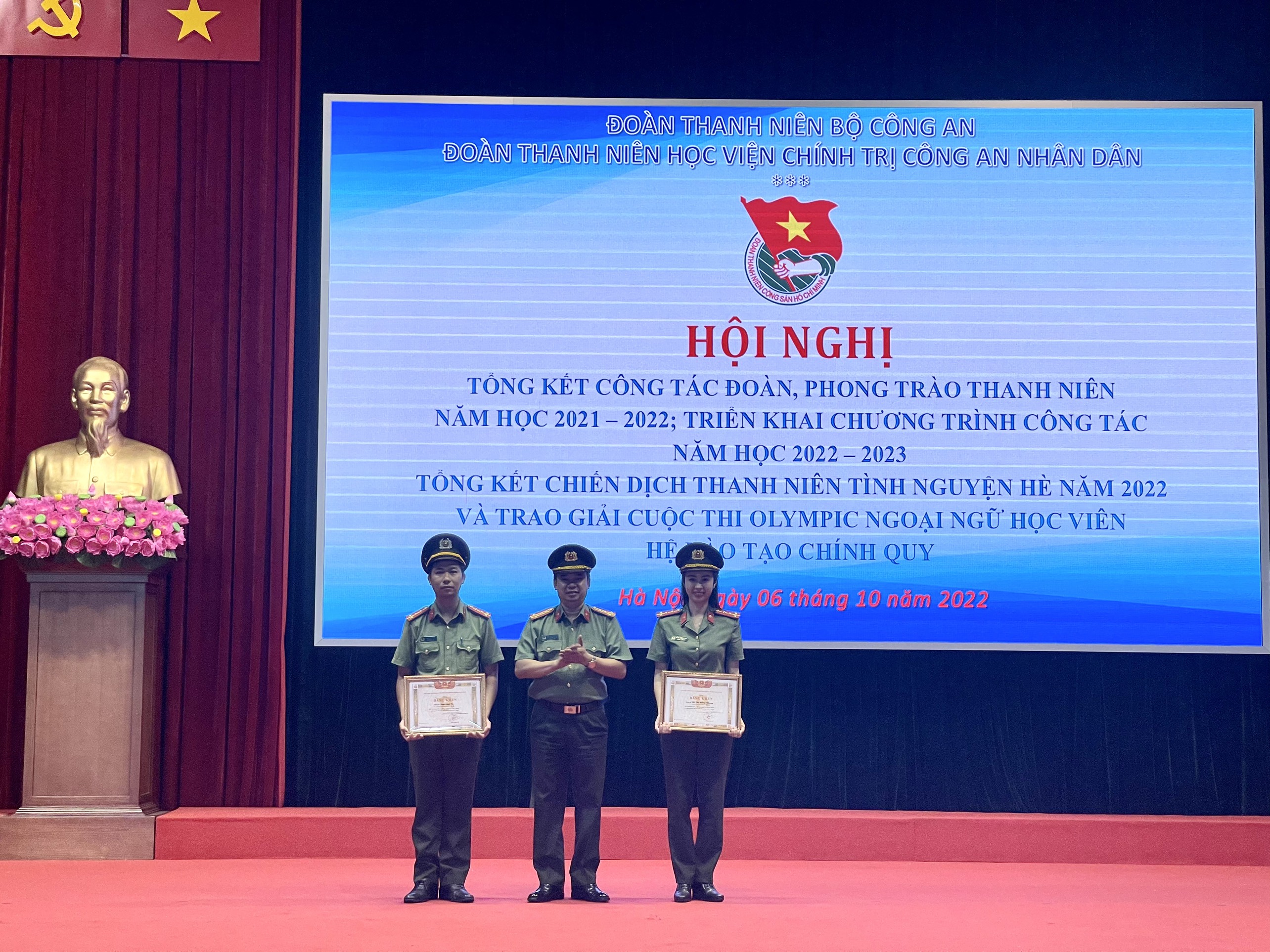 Ngày 06/10/2022, Đoàn Thanh niên Học viện Chính trị CAND tổ chức Hội nghị Tổng kết công tác Đoàn, phong trào thanh niên năm học 2021-2022; triển khai chương trình công tác năm học 2022-2023; tổng kết chiến dịch Thanh niên công an tình nguyện Hè 2022 và trao giải cuộc thi Olympic Ngoại ngữ học viên hệ đào tạo chính quy. Dự và chỉ đạo Hội nghị có đồng chí Đại tá Tống Văn Khuông, Uỷ viên Ban Thường vụ Đảng uỷ, Phó Giám đốc Học viện phụ trách các tổ chức quần chúng.