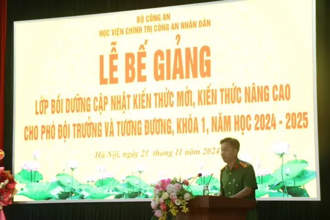 Thực hiện chương trình công tác năm học, ngày 21/11/2024, Học viện Chính trị CAND đã trang trọng tổ chức Lễ bế giảng lớp bồi dưỡng cập nhật kiến thức mới, kiến thức nâng cao cho Phó Đội trưởng và tương đương - Khóa 1, năm học 2024-2025. Đồng chí Thiếu tướng, TS Nguyễn Như Lôi, Phó Bí thư Đảng ủy, Phó Giám đốc Học viện Chính trị CAND chủ trì buổi lễ. Tham dự buổi lễ có đại diện lãnh đạo các đơn vị thuộc Học viện và toàn thể học viên của lớp học.