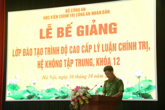 Phát biểu tại buổi lễ, đồng chí Trung tướng, PGS.TS, NGƯT Phan Xuân Tuy, Giám đốc Học viện chúc mừng các đồng chí học viên lớp học đã hoàn thành tốt mục tiêu, yêu cầu của chương trình đào tạo đề ra. Đồng chí khẳng định: thành công của lớp học ngày hôm nay thể hiện sự quan tâm của Đảng ủy Công an Trung ương, Lãnh đạo Bộ Công an đối với công tác đào tạo cao cấp LLCT trong lực lượng CAND; kết quả đào tạo của khóa học giúp tăng cường cho Công an các đơn vị, địa phương nhiều cán bộ nguồn có trình độ cao cấp LLCT đáp ứng yêu cầu công tác cán bộ tại cơ sở. Đồng chí Giám đốc Học viện cũng nhấn mạnh các học viên sau khi hoàn thành khóa học, trở về đơn vị công tác phải luôn nâng cao đạo đức cách mạng, đem những giá trị tri thức tiếp thu được trong quá trình học tập áp dụng ngay vào thực tiễn công tác; tham mưu với cấp ủy, chính quyền địa phương triển khai hiệu quả Nghị quyết số 12-NQ/TW, ngày 16/3/2022 của Bộ Chính trị về “Đẩy mạnh xây dựng lực lượng CAND thật sự trong sạch, vững mạnh, chính quy, tinh nhuệ, hiện đại, đáp ứng yêu cầu, nhiệm vụ trong tình hình mới”. Bên cạnh đó, đồng chí Giám đốc Học viện mong muốn mỗi đồng chí học viên sau khi hoàn thành khóa học, trở về đơn vị công tác luôn luôn là hạt nhân trong các mặt công tác, nhất là công tác tuyên truyền, bảo vệ chủ nghĩa Mác - Lênin, tư tưởng Hồ Chí Minh, đường lối đổi mới của Đảng, Nhà nước, tạo sức lan tỏa mạnh mẽ trong các chi bộ, đảng bộ, cơ quan, đơn vị công tác, trong gia đình, trong quần chúng nhân dân về truyền thống an hùng và hình ảnh tốt đẹp của người chiến sĩ CAND “bản lĩnh, nhân văn, vì nhân dân phục vụ”.
