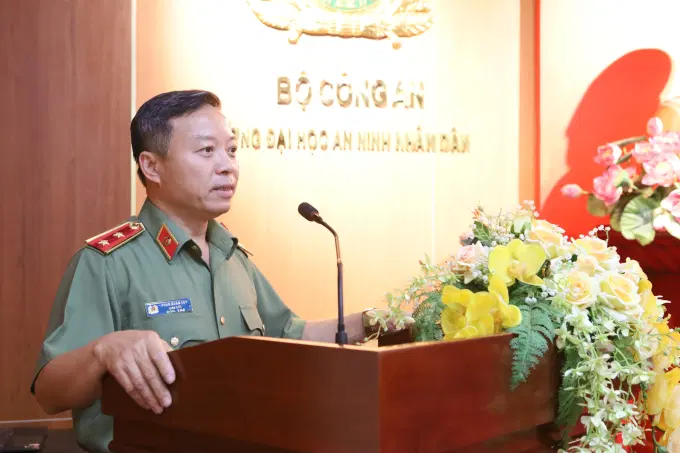 Đại tá, PGS.TS Nguyễn Trần Hiếu, Phó Hiệu trưởng Trường Đại học An ninh nhân dân phát biểu tại buổi lễ