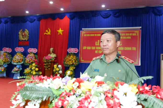 Đồng chí Giám đốc Học viện nhấn mạnh lớp học được tổ chức trong bối cảnh Đại hội đại biểu toàn quốc lần thứ XIII được tổ chức thành công, thắng lợi và ban hành nhiều nghị quyết quan trọng đối với sự nghiệp phát triển kinh tế - xã và bảo đảm quốc phòng an ninh. Toàn Đảng, toàn dân và toàn quân quyết tâm thực hiện thắng lợi các nghị quyết của Đại hội đại biểu toàn quốc lần thứ XIII đề ra, trong đó có Nghị quyết số 12-NQ/TW ngày 16/3/2022 của Bộ Chính trị về đẩy mạnh xây dựng lực lượng CAND thật sự trong sạch, vững mạnh, chính quy, tinh nhuệ, hiện đại, đáp ứng yêu cầu, nhiệm vụ trong tình hình mới; Nghị quyết số 13-NQ/TW ngày 02/4/2022 của Bộ Chính trị về phương hướng phát triển kinh tế - xã hội, bảo đảm quốc phòng, an ninh vùng Đồng bằng sông Cửu Long đến năm 2030, tầm nhìn đến năm 2045. Đảng ủy Công an Trung đã ban hành Nghị quyết Nghị quyết số 16-NQ/ĐUCA, ngày 18/01/2023 về tăng cường công tác chính trị, tư tưởng đáp ứng yêu cầu xây dựng lực lượng CAND thật sự trong sạch, vững mạnh, chính quy, tinh nhuệ, hiện đại… Đồng chí Giám đốc Hoc viện quán triệt và đề nghị các học viên sau khi hoàn thành khóa học, trở về đơn vị công tác luôn luôn là những hạt nhân mẫu mực về giáo dục chính trị tư tưởng, tích cực truyền bá những giá trị đạo đức cách mạng, đem những tri thức tiếp thu được trong quá trình học tập áp dụng ngay vào thực tiễn công tác; tham mưu với cấp ủy các cấp, chính quyền địa phương nơi đơn vị đóng quân triển khai có hiệu quả các Nghị quyết của Bộ Chính trị đã ban hành. Phát huy vai trò là những hạt nhân trong các mặt công tác, nhất là công tác tuyên truyền, bảo vệ chủ nghĩa Mác - Lênin, tư tưởng Hồ Chí Minh, đường lối đổi mới của Đảng, Nhà nước, tạo sức lan tỏa mạnh mẽ trong các chi bộ, đảng bộ, cơ quan, đơn vị công tác, trong gia đình, trong quần chúng nhân dân về truyền thống an hùng và hình ảnh tốt đẹp của người chiến sĩ CAND “bản lĩnh, nhân văn, vì nhân dân phục vụ”.