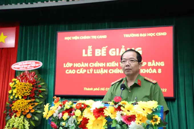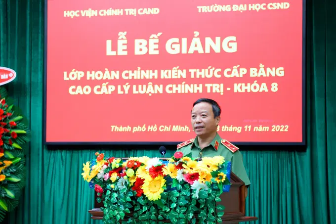 Phát biểu tại buổi Lễ, đồng chí Giám đốc Học viện cho biết lớp học được tổ chức trong bối cảnh tình hình dịch bệnh Covid-19 diễn biến phức tạp trên phạm vi toàn quốc nói chung và tại Thành phố Hồ Chí Minh nói riêng nhưng với sự lãnh đạo, chỉ đạo sát sao của Đảng ủy, Ban Giám đốc Học viện Chính trị CAND, Trường Đại học Cảnh sát nhân dân; sự cố gắng, nỗ lực của học viên lớp học và tinh thần, trách nhiệm cao của đội ngũ giảng viên, cán bộ quản lý, khoá học đã thành công, hoàn thành tốt mục tiêu, yêu cầu chương trình đào tạo đề ra. Trong đó, học viên tốt nghiệp xếp loại Giỏi chiếm tỷ lệ cao, nhiều học viên được tặng giấy khen. Đồng chí mong muốn các học viên sau khi hoàn thành khóa học, trở về đơn vị công tác sẽ luôn tích cực truyền bá những giá trị đạo đức cách mạng, đem những giá trị tri thức tiếp thu được trong quá trình học tập áp dụng vào thực tiễn công tác; phát huy vai trò là những hạt nhân trong các mặt công tác, nhất là công tác tuyên truyền, bảo vệ chủ nghĩa Mác - Lênin, tư tưởng Hồ Chí Minh, đường lối đổi mới của Đảng, Nhà nước, tạo sức lan tỏa mạnh mẽ trong các chi bộ, đảng bộ, cơ quan, đơn vị công tác, thực hiện thắng lợi các Nghị quyết của Bộ Chính trị Khóa XIII về phương hướng phát triển kinh tế - xã hội, bảo đảm quốc phòng, an ninh các vùng kinh tế - xã hội; Nghị quyết số 12-NQ/TW, ngày 16/3/2022 của Bộ Chính trị về đẩy mạnh xây dựng lực lượng CAND thật sự trong sạch, vững mạnh, chính quy, tinh nhuệ, hiện đại, đáp ứng yêu cầu, nhiệm vụ trong tình hình mới.