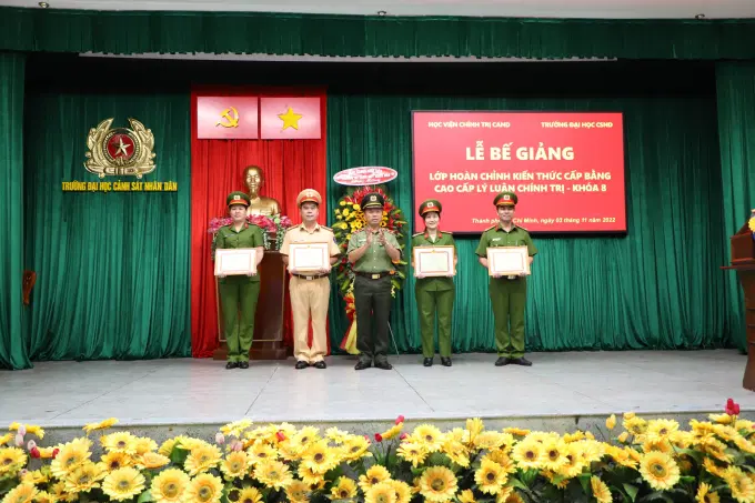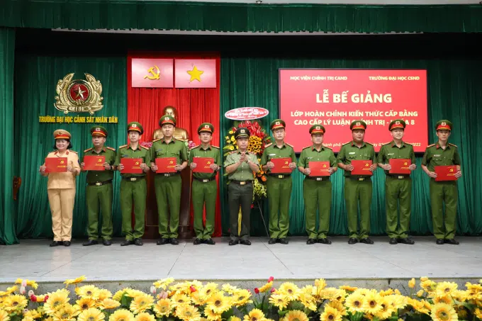 Thực hiện kế hoạch chương trình đào tạo của Học viện, ngày 03/11/2022, tại Trường Đại học Cảnh sát nhân dân, Học viện Chính trị CAND tổ chức Lễ bế giảng Lớp hoàn chỉnh kiến thức cấp bằng cao cấp LLCT - Khóa 8. Đồng chí Trung tướng, PGS.TS Phan Xuân Tuy, Bí thư Đảng ủy, Giám đốc Học viện chủ trì buổi Lễ, tham dự buổi Lễ bế giảng có đồng chí Đại tá, PGS.TS Nguyễn Thành Phúc, Ủy viên Ban thường vụ Đảng ủy, Phó Hiệu trưởng Trường Đại học Cảnh sát nhân dân; đại diện lãnh đạo các đơn vị chức năng của Học viện Chính trị CAND, Trường Đại học Cảnh sát nhân dân cùng toàn thể học viên lớp học.