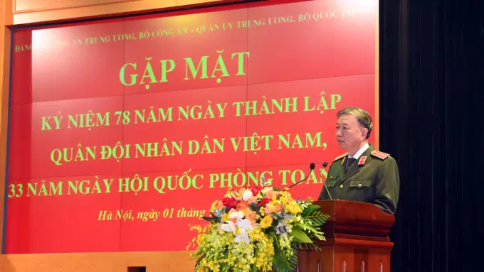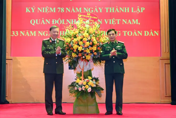 Nhân dịp này, Bộ trưởng Tô Lâm đã chúc mừng lực lượng QĐND anh hùng nhân kỷ niệm 78 năm Ngày thành lập và 33 năm Ngày hội Quốc phòng toàn dân; chúc toàn thể tướng lĩnh, cán bộ, chiến sĩ, công nhân viên lực lượng quốc phòng dồi dào sức khỏe, gia đình hạnh phúc, thành công trong công tác và cuộc sống.