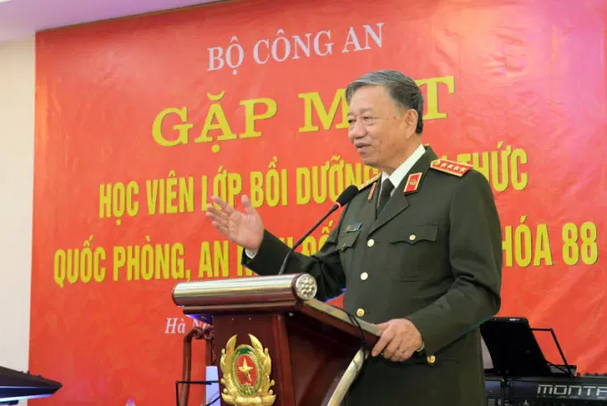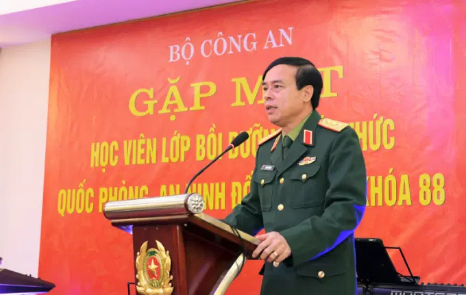 Phát biểu tại buổi gặp mặt, thay mặt Đảng ủy Công an Trung ương, Bộ Công an, Bộ trưởng Tô Lâm nhiệt liệt chào mừng và chúc sức khỏe các đồng chí lãnh đạo Đảng ủy, Ban Giám đốc Học viện Quốc phòng, lãnh đạo các cơ quan, đơn vị, ban, ngành ở Trung ương và địa phương đang tham dự Lớp bồi dưỡng kiến thức Quốc phòng, An ninh đối tượng 1, Khóa 88.