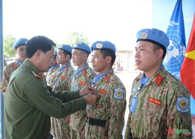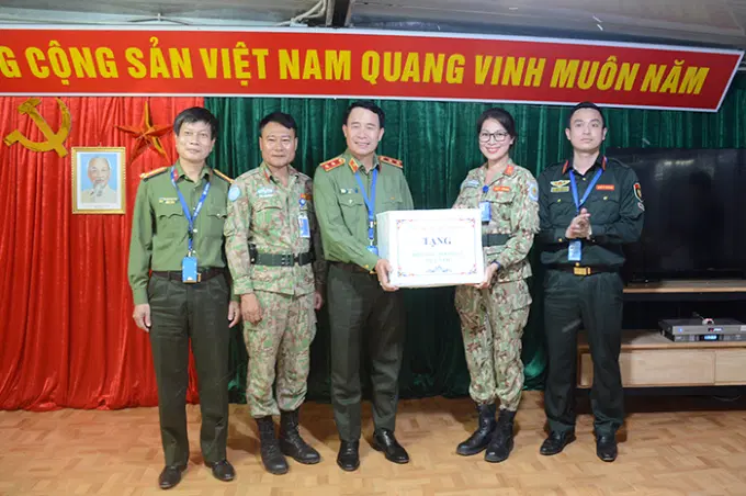 Thứ trưởng Lê Quốc Hùng trao quà của Bộ Công an tặng các lực lượng GGHB của Việt Nam tại Phái bộ UNISFA.