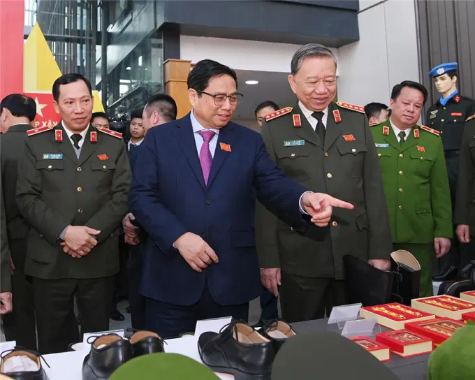 | Thủ tướng Chính phủ Phạm Minh Chính; Bộ trưởng Tô Lâm cùng các đại biểu tham quan khu triển lãm bên lề Hội nghị. |