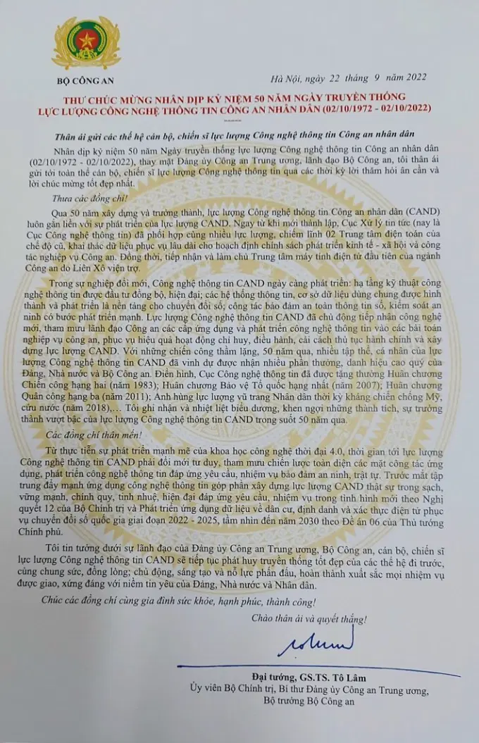 Nhân dịp kỷ niệm 50 năm Ngày truyền thống lực lượng Công nghệ thông tin Công an nhân dân Việt Nam (02/10/1972 - 02/10/2022), Đại tướng Tô Lâm - Ủy viên Bộ Chính trị, Bí thư Đảng ủy Công an Trung ương, Bộ trưởng Bộ Công an có Thư chúc mừng, động viên các thế hệ cán bộ, chiến sĩ lực lượng Công nghệ thông tin Công an Nhân dân. Trang Thông tin điện tử Học viện Chính trị CAND trân trọng giới thiệu toàn văn Thư chúc mừng.