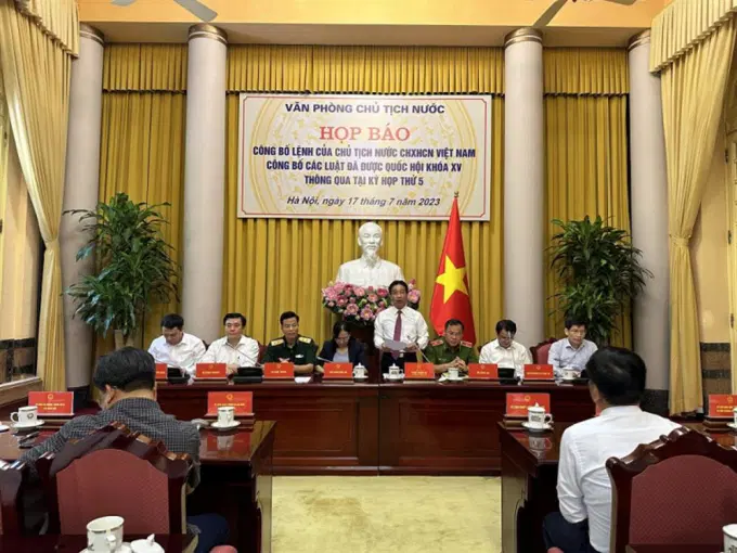 Sáng 17/7, tại Hà Nội, Văn phòng Chủ tịch nước đã tổ chức họp báo công bố Lệnh của Chủ tịch nước về 08 luật đã được Quốc hội khóa XV thông qua tại Kỳ họp thứ 5; trong đó, có 02 luật do Bộ Công an chủ trì soạn thảo. Phó Chủ nhiệm Văn phòng Chủ tịch nước Phạm Thanh Hà chủ trì họp báo; Thiếu tướng Nguyễn Văn Long, Thứ trưởng Bộ Công an tham dự và phát biểu tại họp báo.
