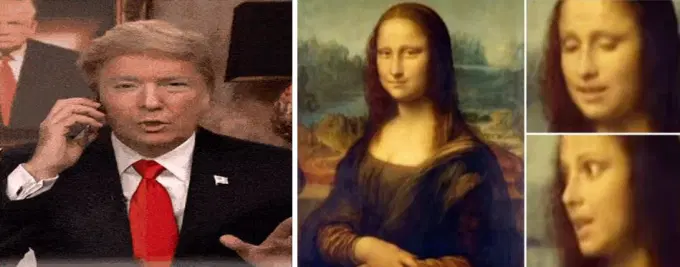 Theo chiều kim đồng hồ: 1. Donald Trump giả do diễn viên Jimmy Fallon thủ vai (mặt bên trái) và Donald Trump giả do deepfake tạo ra (mặt bên phải) từ cùng một video; 2. Mona Lisa trong tranh nguyên bản (trái) và hình ảnh Mona Lisa biết biểu cảm và nói chuyện (phải) do AI của Samsung tạo ra.