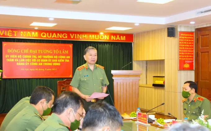 Phát biểu tại buổi làm việc, Bộ trưởng Tô Lâm khẳng định: Đảng ủy Công an Trung ương đang tập trung chỉ đạo xây dựng Đề án "Xây dựng lực lượng CAND đến năm 2030 cách mạng, chính quy, tinh nhuệ, hiện đại", trong đó xây dựng đội ngũ cán bộ Kiểm tra Đảng các cấp trong CAND đủ sức đáp ứng yêu cầu, nhiệm vụ thời gian tới là yêu cầu cấp bách hiện nay. Buổi làm việc của đồng chí Bộ trưởng, lãnh đạo các đơn vị chức năng thuộc Bộ với Cơ quan UBKT Đảng ủy Công an Trung ương nhằm đánh giá kết quả thực hiện nhiệm vụ công tác chuyên môn và bàn các nhiệm vụ, giải pháp cụ thể để xây dựng UBKT, Cơ quan UBKT các cấp trong CAND đáp ứng yêu cầu, nhiệm vụ trong thời gian tới.