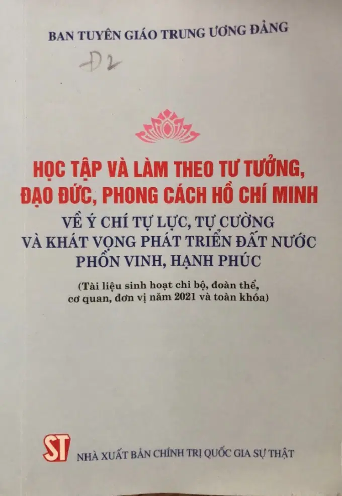 Thực hiện Kết luận số 01-KL/TW, ngày 18/5/2021 của Bộ Chính trị về tiếp tục thực hiện Chỉ thị số 05-CT/TW, ngày 15/5/2016 của Bộ Chính trị khóa XII “về đẩy mạnh học tập và làm theo tư tưởng, đạo đức, phong cách Hồ Chí Minh”; tiếp tục thực hiện Kế hoạch số 03-KH/TW, ngày 25/7/2016 của Ban Bí thư Trung ương Đảng về thực hiện Chỉ thị số 05-CT/TW, ngày 15/5/2016 của Bộ Chính trị “về đẩy mạnh học tập và làm theo tư tưởng, đạo đức, phong cách Hồ Chí Minh”, quyết tâm thực hiện thắng lợi Nghị quyết Đại hội XIII của Đảng, Ban Tuyên giáo Trung ương Đảng tổ chức biên soạn và phối hợp với Nhà xuất bản Chính trị quốc gia Sự thật xuất bản chuyên đề: Học tập và làm theo tư tưởng đạo đức, phong cách Hồ Chí Minh về ý chí tự lực, tự cường và khát vọng phát triển đất nước phồn vinh, hạnh phúc (Tài liệu sinh hoạt chi bộ, đoàn thế, cơ quan, đơn vị năm 2021 và toàn khóa).