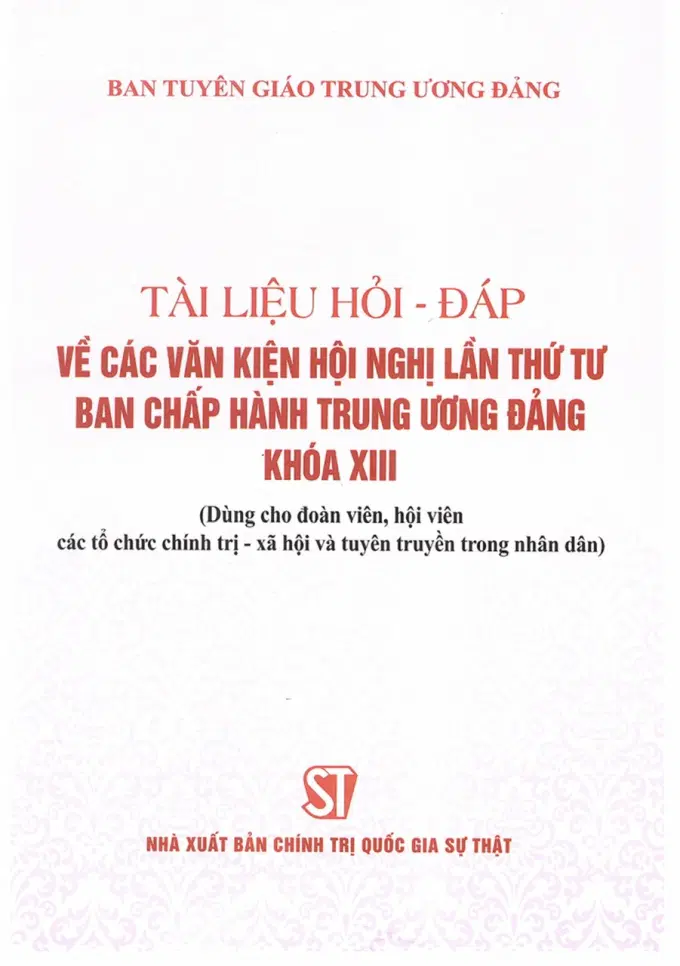 Để giúp các cấp, các ngành học tập, quán triệt và triển khai thực hiện Nghị quyết Hội nghị lần thứ tư Ban Chấp hành Trung ương Đảng khóa XIII, Ban Tuyên giáo Trung ương Đảng tổ chức biên soạn, phối hợp với Nhà xuất bản Chính trị quốc gia Sự thật xuất bản các tài liệu: Tài liệu học tập các văn kiện Hội nghị lần thứ tư Ban Chấp hành Trung ương Đảng khóa XIII (Dùng cho cán bộ, đảng viên ở cơ sở); Tài liệu hỏi - đáp về các văn kiện Hội nghị lần thứ tư Ban Chấp hành Trung ương Đảng khóa XIII (Dùng cho đoàn viên, hội viên các tổ chức chính trị - xã hội và tuyên truyền trong nhân dân); Tài liệu nghiên cứu các văn kiện Hội nghị lần thứ tư Ban Chấp hành Trung ương Đảng khóa XIII (Dùng cho cán bộ chủ chốt và báo cáo viên).