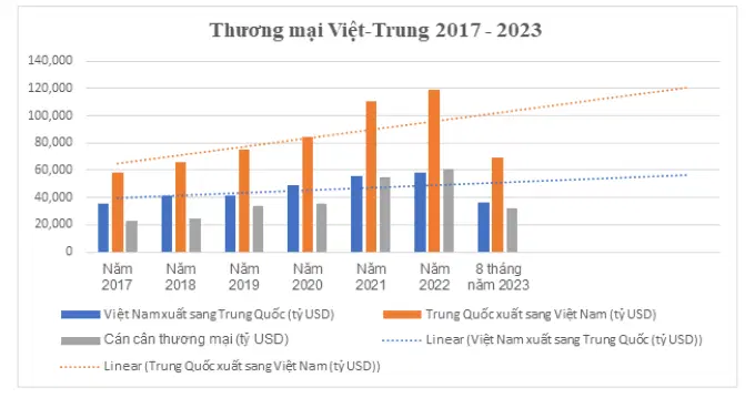 Gần đây nhất, theo thống kê sơ bộ Tổng cục Hải quan vừa công bố, đến hết tháng 8.2023, quy mô kim ngạch xuất nhập khẩu giữa Việt Nam và Trung Quốc đạt 105,45 tỷ USD. Trong đó, xuất khẩu của Việt Nam sang Trung Quốc đạt 36,61 tỷ USD, tăng 2,35% so với cùng kỳ năm ngoái. Hiện nay, Trung Quốc là thị trường xuất khẩu lớn thứ hai của Việt Nam chiếm 16% kim ngạch xuất khẩu cả nước. Chiều ngược lại, nhập khẩu của Việt Nam từ Trung Quốc trong 8 tháng đầu năm 2023 đạt 68,84 tỷ USD (nhập siêu 32,23 tỷ USD). Đây vẫn là thị trường Việt Nam nhập khẩu hàng hóa lớn nhất, chiếm 33% kim ngạch cả nước.