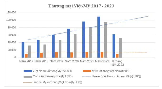 Đối với Mỹ: Thương mại Việt-Mỹ có bước tăng trưởng hết sức ngoạn mục từ sau khi bình thường hóa. Nếu lấy điểm khởi đầu là năm 1994 (sau khi Tổng thống B.Clinton bãi bỏ lệnh cấm vận kinh tế thương mại đối với Việt Nam) thương mại giữa 2 nước mới chỉ đạt khoảng 450 triệu USD, thì đến năm 2022, tổng kim ngạch thương mại giữa 2 nước đã cán mốc 123,9 tỷ USD. Tính đến tháng 8.2023, tổng kim ngạch thương mại Việt-Mỹ đạt 71,6 tỷ USD. Trong đó, Việt Nam nhập khẩu từ Mỹ 9,3 tỷ và xuất sang thị trường này 62,3 tỷ USD (xuất siêu 53 tỷ USD). Đây cũng chính là thị trường xuất khẩu lớn nhất và đạt kim ngạch xuất siêu cao nhất của hàng hóa Việt Nam trong nhiều năm trở lại đây. Tuy vậy, dù Mỹ hiện là thị trường xuất khẩu lớn nhất, nhưng Trung Quốc lại là nguồn cung cấp nguyên liệu thô quan trọng nhất cho hàng hóa xuất khẩu của Việt Nam. Xét về ý nghĩa kinh tế, cả hai thị trường đều có giá trị, vai trò quan trọng và sự tương hỗ lẫn nhau.