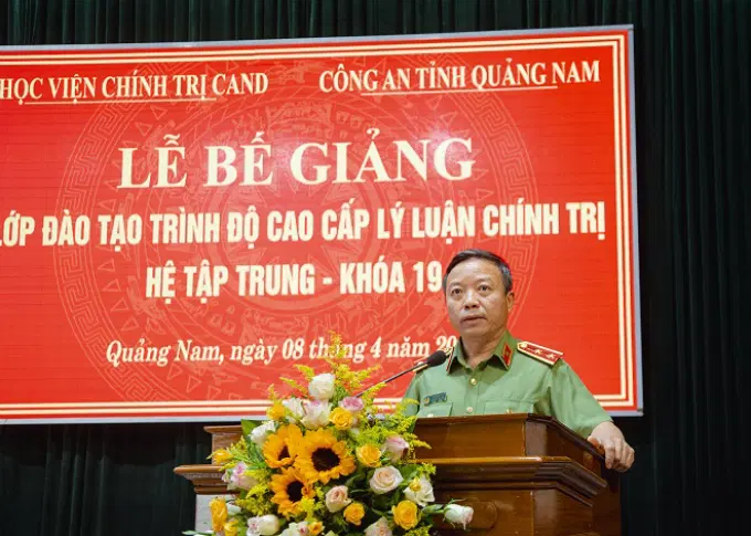 Phát biểu tại Lế bế giảng, Trung tướng, PGS. TS Phan Xuân Tuy, Giám đốc Học viện Chính trị CAND gửi lời cảm ơn sâu sắc tới Công an tỉnh Quảng Nam và Công an các đơn vị, địa phương có học viên theo học đã phối hợp với Học viện trong quá trình tổ chức khóa học, đã giúp đỡ, tạo điều kiện để lớp học diễn ra thành công tốt đẹp; Biểu dương sự cố gắng, nỗ lực , đoàn kết, khắc phục khó khăn của tập thể học viên khóa học vượt qua đại dịch để đạt được kết quả như ngày hôm nay. Đồng chí cũng đề nghị các đồng chí học viên lớp học phải nhận thức, hành động quyết liệt hơn nữa để làm thật tốt công tác xây dựng, chỉnh đốn Đảng theo tinh thần Nghị quyết Đại hội XIII. Đồng chí tin tưởng rằng với những kiến thức được học tập trong thời gian qua, các học viên sẽ trưởng thành và hiểu sâu hơn về lý luận chính trị; trau dồi bản lĩnh chính trị, vững tin vào con đường mà Đảng, Bác Hồ và nhân dân ta đã lựa chọn. Đồng thời, nâng cao phương pháp, kỹ năng lãnh đạo, quản lý trên các cương vị công tác, góp phần hoàn thành xuất sắc nhiệm vụ chính trị do Đảng, Nhà nước, đơn vị địa phương giao phó và mong rằng trong thời gian tới, Học viện Chính trị CAND sẽ tiếp tục nhận được sự quan tâm, chỉ đạo, giúp đỡ của các cấp lãnh đạo, các cơ quan, đơn vị để có thể tổ chức thành công các khóa đào tạo cao cấp chính trị theo chỉ tiêu mà Ban Tổ chức Trung ương, Bộ Công an đã tin tưởng giao cho Học viện Chính trị CAND.
