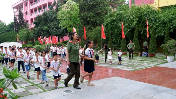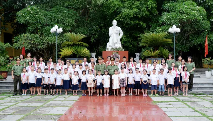 Đồng chí Thượng tá, TS Nguyễn Văn Tuấn, Phó Giám đốc Học viện , lãnh đạo các đơn vị cùng các cháu thiếu nhi lớp học dâng hương, dâng hoa tại Tượng đài Bác Hồ: