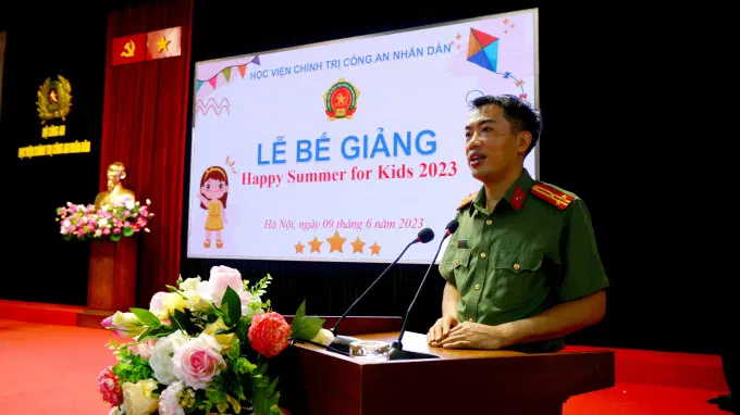 Đồng chí Thượng tá, TS Nguyễn Văn Tuấn, Phó Giám đốc Học viện phát biểu chỉ đạo và căn dặn các cháu thiếu nhi lớp học tại buổi Lễ Bế giảng.
