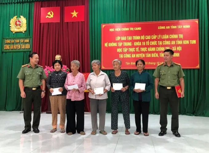 Nhân dịp này, Đoàn đã trao tặng 05 suất quà cho các gia đình chính sách, có công với cách mạng có hoàn cảnh khó khăn đang sinh sống trên địa bàn huyện Tân Biên, tỉnh Tây Ninh. Đây là hoạt động ý nghĩa, thể hiện truyền thống “Uống nước nhớ nguồn”, “Ăn quả, nhớ người trồng cây”, chia sẻ những khó khăn trong cuộc sống với các gia đình chính sách, gia đình có công với cách mạng. Và tặng quà lưu niệm cho Công an huyện Tân Biên và Công an xã Tân Lập, huyện Tân Biên (địa bàn đứng chân của Trung ương Cục Miền Nam).