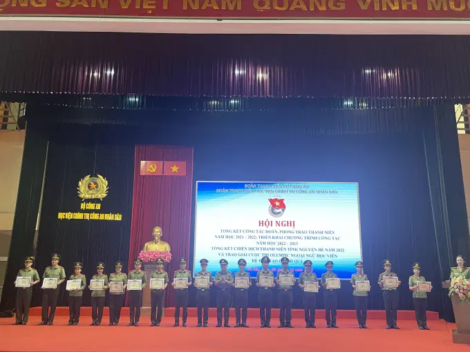 Đồng chí Đại tá Tống Văn Khuông, Phó Giám đốc Học viện trao giấy khen cho các tập thể, cá nhân có thành tích xuất sắc trong công tác đoàn năm học 2021-2022; trao bằng khen của Trung ương đoàn, Đoàn Bộ Công an cho các tập thể, cá nhân có thành tích xuất sắc trong hoạt động đoàn và trao giấy khen cho các tập thể, cá nhân đạt giải cuộc thi Olympic Ngoại ngữ học viên hệ đào tạo chính quy