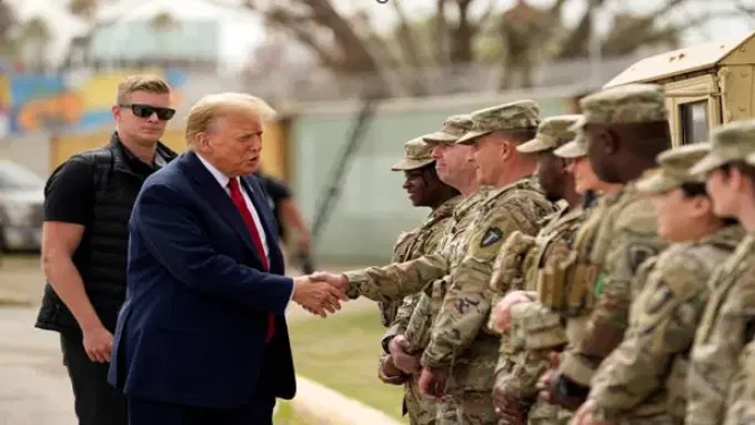 Tổng thống đắc cử Mỹ Donald Trump chào đón các thành viên của Vệ binh Quốc gia tại biên giới Mỹ-Mexico ở Eagle Pass, Texas [Ảnh: Eric Gay/AP].