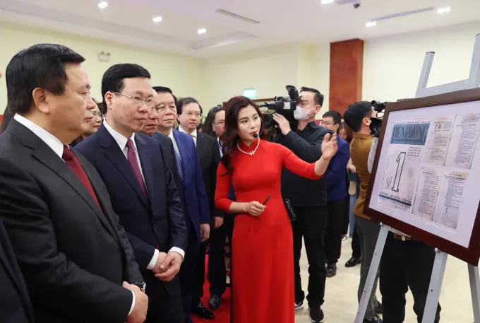 Ủy viên Bộ Chính trị, Thường trực Ban Bí thư Võ Văn Thưởng cùng các đồng chí lãnh đạo Đảng và Nhà nước tham quan triển lãm ảnh Kỷ niệm 80 năm Đề cương về văn hóa Việt Nam (1943 - 2023) tại Hội thảo khoa học cấp quốc gia: “80 năm Đề cương về văn hóa Việt Nam - Khởi nguồn và động lực phát triển”, ngày 27-2-2023 _Ảnh: TTXVN