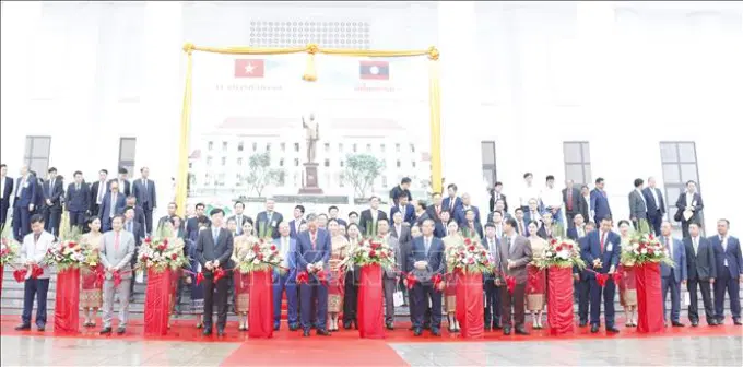 Lễ cắt băng khánh thành Học viện Chính trị Công an Lào. Ảnh: Phạm Kiên/PV TTXVN tại Lào