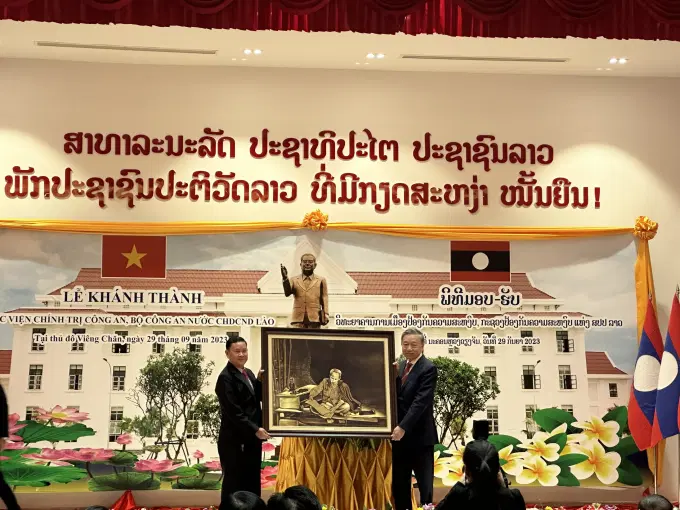 Bộ trưởng Tô Lâm chúc Học viện Chính trị Công an Lào ngày càng vững mạnh và trưởng thành, xứng đáng là Trung tâm đào tạo, bồi dưỡng lý luận chính trị lớn của Bộ Công an và của đất nước Lào, xứng đáng là biểu tượng trong quan hệ, hợp tác giữa lực lượng công an hai nước Việt Nam - Lào.