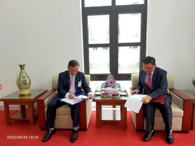 Đồng chí Trung tướng, PGS.TS Phan Xuân Tuy, Giám đốc Học viện Chính trị CAND Việt Nam và đồng chí Đại tá Xai-khong Phết- xạ-vông, Giám đốc Học viện Chính trị CAND Lào ký biên bản bàn giao giáo trình, tài liệu