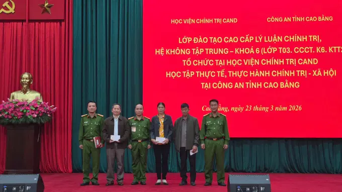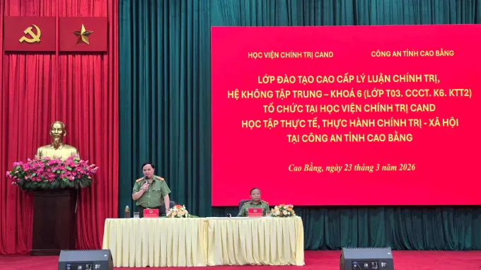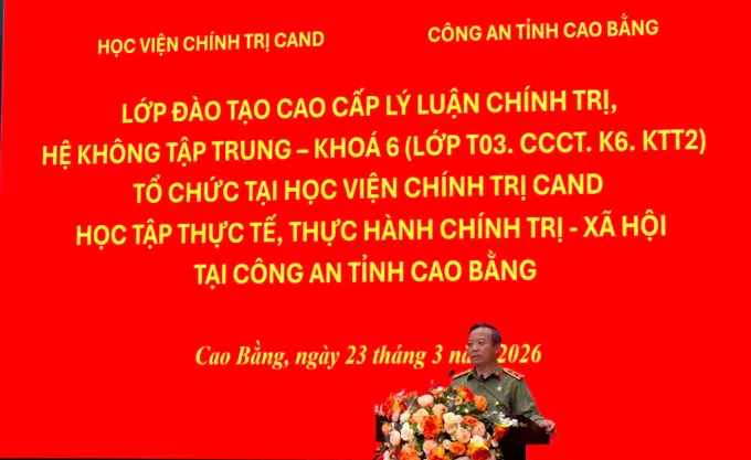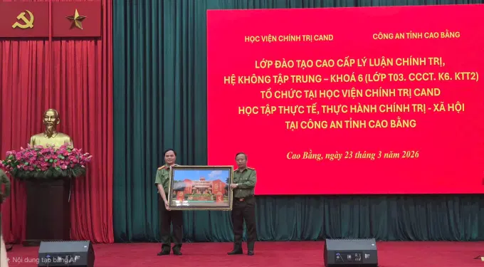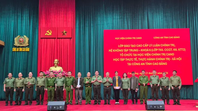 Thực hiện Kế hoạch số 52/KH-T03-P3, ngày 09/01/2026 của Học viện Chính trị Công an nhân dân về việc tổ chức đi học tập thực tế, thực hành chính trị - xã hội cho lớp đào tạo trình độ cao cấp lý luận chính trị, hệ không tập trung - Khóa 6 (lớp T03.CCCT.K6.KTT2), từ ngày 23 đến ngày 27/3/2026, Học viện Chính trị CAND đã tổ chức Đoàn công tác đến Công an tỉnh Cao Bằng để học tập, trao đổi kinh nghiệm về công tác chính trị, tư tưởng, tổ chức cán bộ và xây dựng lực lượng CAND. Đoàn công tác do đồng chí Trung tướng, PGS.TS, NGƯT Phan Xuân Tuy, Giám đốc Học viện Chính trị CAND làm Trưởng đoàn; tham gia Đoàn có đại diện lãnh đạo Phòng Quản lý đào tạo và bồi dưỡng nâng cao, Phòng Chính trị cùng tập thể học viên lớp T03.CCCT.K6.KTT2.