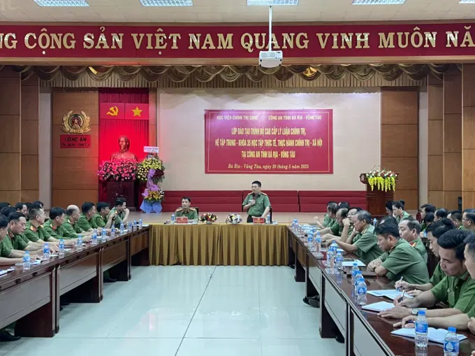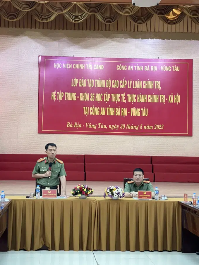 Thực hiện Kế hoạch số 1104/KH-T03-P3, ngày 22/5/2023 của Học viện Chính trị CAND, từ ngày 28/5/2023 đến ngày 31/5/2023, Học viện Chính trị CAND đã tổ chức cho học viên lớp đào tạo trình độ cao cấp LLCT, hệ tập trung - Khóa 35 tổ chức tại Cục Cảnh sát quản lý trại giam, cơ sở giáo dục bắt buộc, trường giáo dưỡng (địa điểm mở lớp tại Trại giam Cái Tàu) đi học tập thực tế, thực hành chính trị - xã hội tại Công an tỉnh Bà Rịa - Vũng Tàu. Đồng chí Thượng tá, TS Nguyễn Văn Tuấn, Phó Giám đốc Học viện Chính trị CAND làm Trưởng đoàn. Tham gia Đoàn công tác có đại diện lãnh đạo Phòng Quản lý đào tạo và bồi dưỡng nâng cao, cán bộ quản lý lớp học và toàn thể học viên lớp học.