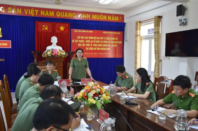 Tiếp đó, đồng chí Đại tá Võ Thị Trinh, Ủy viên Ban Thường vụ Đảng ủy, Phó Giám đốc Công an tỉnh đã giới thiệu khái quát những nét cơ bản về lịch sử, truyền thống, con người của vùng đất Quảng Nam; điều hành phần trao đổi, học tập thực tế của lãnh đạo các đơn vị chức năng trong Công an tỉnh và học viên lớp học.