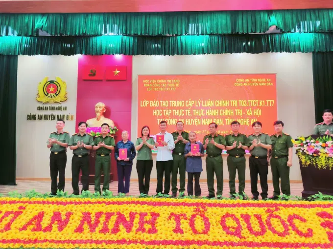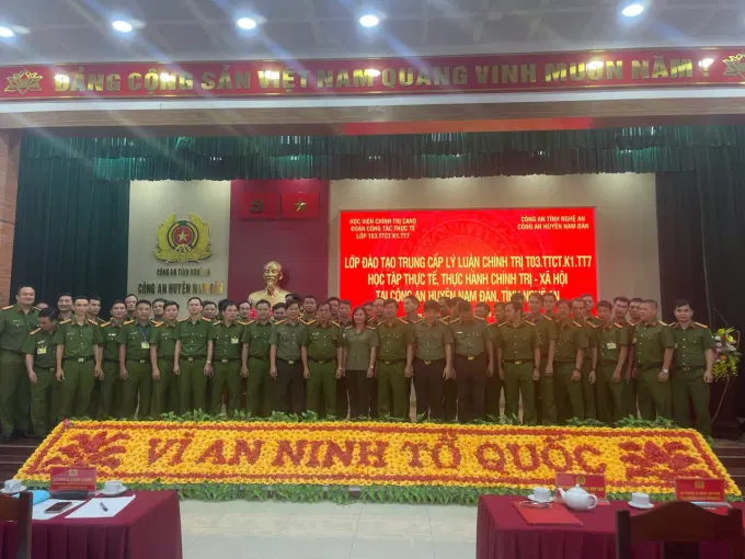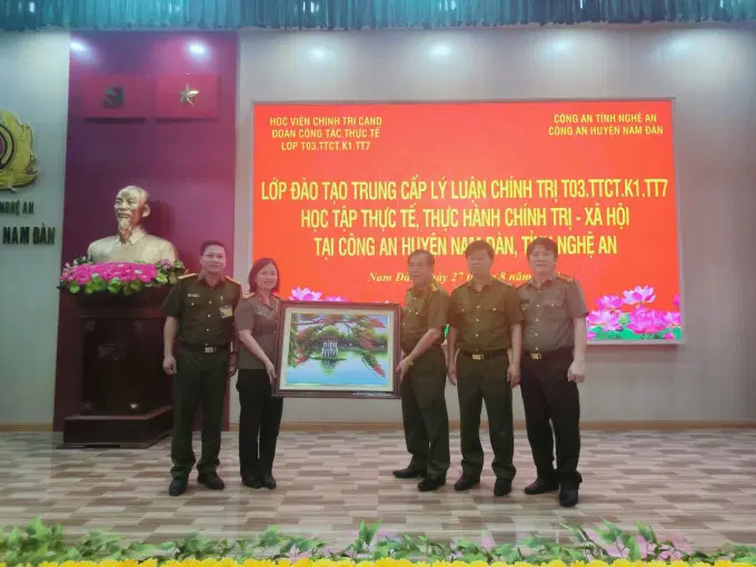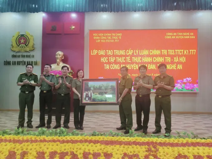 Theo kế hoạch, chiều ngày 27/8/2024, học viên lớp học đã tham gia buổi học tập thực tế, trao đổi kinh nghiệm tại Công an huyện Nam Đàn, tỉnh Nghệ An. Tham dự buổi làm việc, về phía Học viện Chính trị CAND có đồng chí Thượng tá Nguyễn Thị Duyên, Phó Trưởng phòng Quản lý đào tạo và bồi dưỡng nâng cao; đồng chí Trung tá Lê Thế Cương, Phó Trưởng khoa Xây dựng Đảng và chính quyền nhà nước; giáo viên chủ nhiệm và 50 học viên lớp học. Về phía Công an huyện Nam Đàn, tỉnh Nghệ An, có đồng chí Thượng tá Cao Văn Tám, Ủy viên Ban Thường vụ Huyện ủy, Bí thư Đảng ủy, Trưởng Công an huyện; đồng chí Trung tá Tăng Văn Tĩnh, Phó Bí thư Đảng ủy, Phó Trưởng Công an huyện; đồng chí Thượng tá Đặng Công Đàn, Phó Trưởng Công an huyện; đồng chí Thượng tá Nguyễn Văn Hùng, Phó Trưởng Công an huyện và chỉ huy các đội công tác của Công an huyện Nam Đàn, tỉnh Nghệ An.
