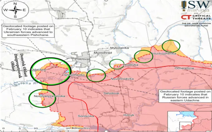 Bản đồ chiến sự Nga - Ukraine tại vùng Donetsk ngày 10/2 với tâm điểm Pokrovsk. Trong đó, Moscow kiểm soát khu vực màu hồng, những vòng tròn thể hiện các mặt trận, kích thước càng lớn càng nóng bỏng. Các khu vực màu vàng là nơi họ mới giành được (Ảnh: ISW).