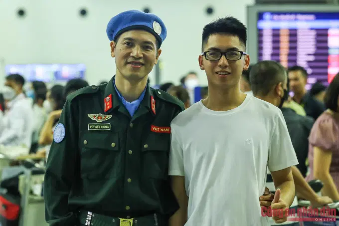 Trung tá Lương Thị Trà Vinh cùng đồng đội chụp ảnh lưu niệm tại sân bay. Chia sẻ với PV báo CAND, Trung tá Lương Thị Trà Vinh cảm thấy rất vinh dự và tự hào khi được Đảng uỷ Công an Trung ương, lãnh đạo Bộ Công an tin tưởng, giao phó nhiệm vụ thiêng liêng này. Chị cũng cảm thấy mình rất may mắn khi có một hậu phương vững chắc luôn ủng hộ chị.