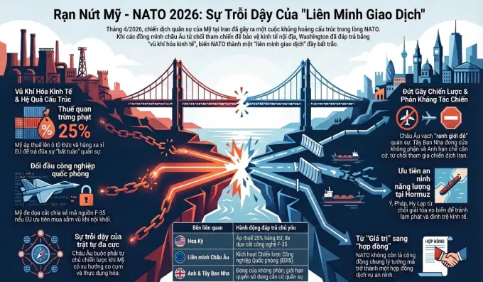 Tháng 4 năm 2026 ghi nhận một biến cố mang tính bước ngoặt trong lịch sử hệ thống an ninh phương Tây. Việc Hoa Kỳ phát động chiến dịch quân sự tại Iran không chỉ làm gia tăng nhiệt độ tại Trung Đông mà còn kích hoạt một cuộc khủng hoảng mang tính cấu trúc ngay trong lòng khối Hiệp ước Bắc Đại Tây Dương (NATO). Dưới góc độ địa kinh tế và chính trị quốc tế, sự khước từ tham chiến của các đồng minh châu Âu và đòn đáp trả bằng "vũ khí hóa kinh tế" của Washington đã đánh dấu sự kết thúc của kỷ nguyên "liên minh giá trị", mở ra một giai đoạn "liên minh giao dịch" đầy thực dụng và bất trắc.