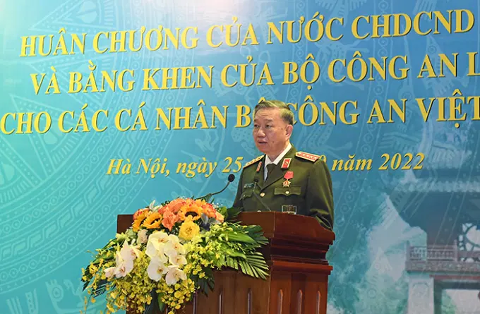 Phát biểu tại buổi lễ, Bộ trưởng Tô Lâm nêu rõ: "trong không khí hai Đảng, hai Nhà nước và nhân dân hai nước Việt Nam – Lào đang nô nức tổ chức các hoạt động kỷ niệm Năm đoàn kết hữu nghị Việt Nam - Lào năm 2022, hôm nay, Bộ Công an Việt Nam rất vinh dự được đón nhận Huân chương của Nhà nước CHDCND Lào và Bằng khen của Bộ Công an Lào trao tặng các cá nhân đã có thành tích góp phần vun đắp và thắt chặt mối quan hệ hữu nghị vĩ đại, đoàn kết đặc biệt và hợp tác toàn diện giữa hai nước Việt Nam – Lào nói chung, giữa lực lượng Công an hai nước nói riêng."